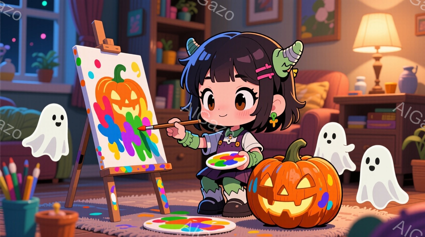 明るいリビングで、緑色の肌をした小さな女の子がキャンバスにカボチャを描いています。彼女は黒いリボンと赤い十字架の飾りがついた髪、水玉模様のドレス、黒い靴を履いており、集中した表情で絵を描いています。背景にはハロウィーンの飾り、カボチャ、そしてほのかに光る幽霊たちが暖かく、お祝いムードを醸し出しています。