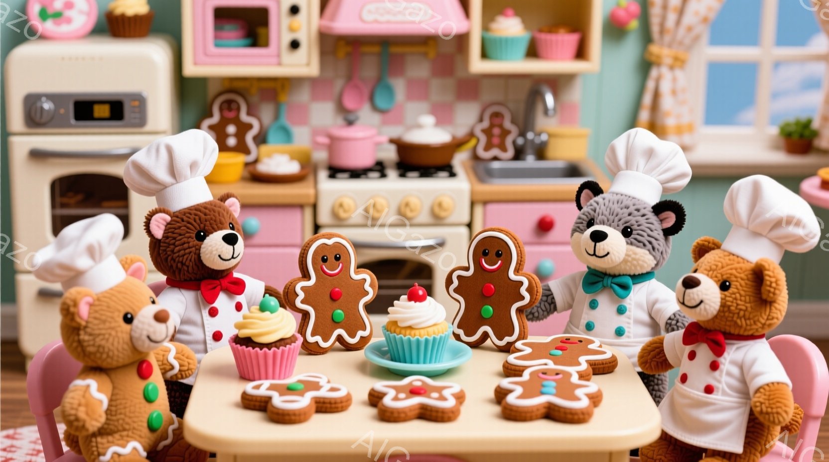 ぬいぐるみたちが料理をしている様子が描かれています。彼らは白いコックハットと赤い縁取りの白いエプロンを着ており、様々な焼き菓子を前に集まっています。背景には、おもちゃのようなキッチンと、ジンジャーブレッドマンの飾り、カップケーキが並べられた棚があり、全体的に暖かく、楽しい雰囲気が漂っています。