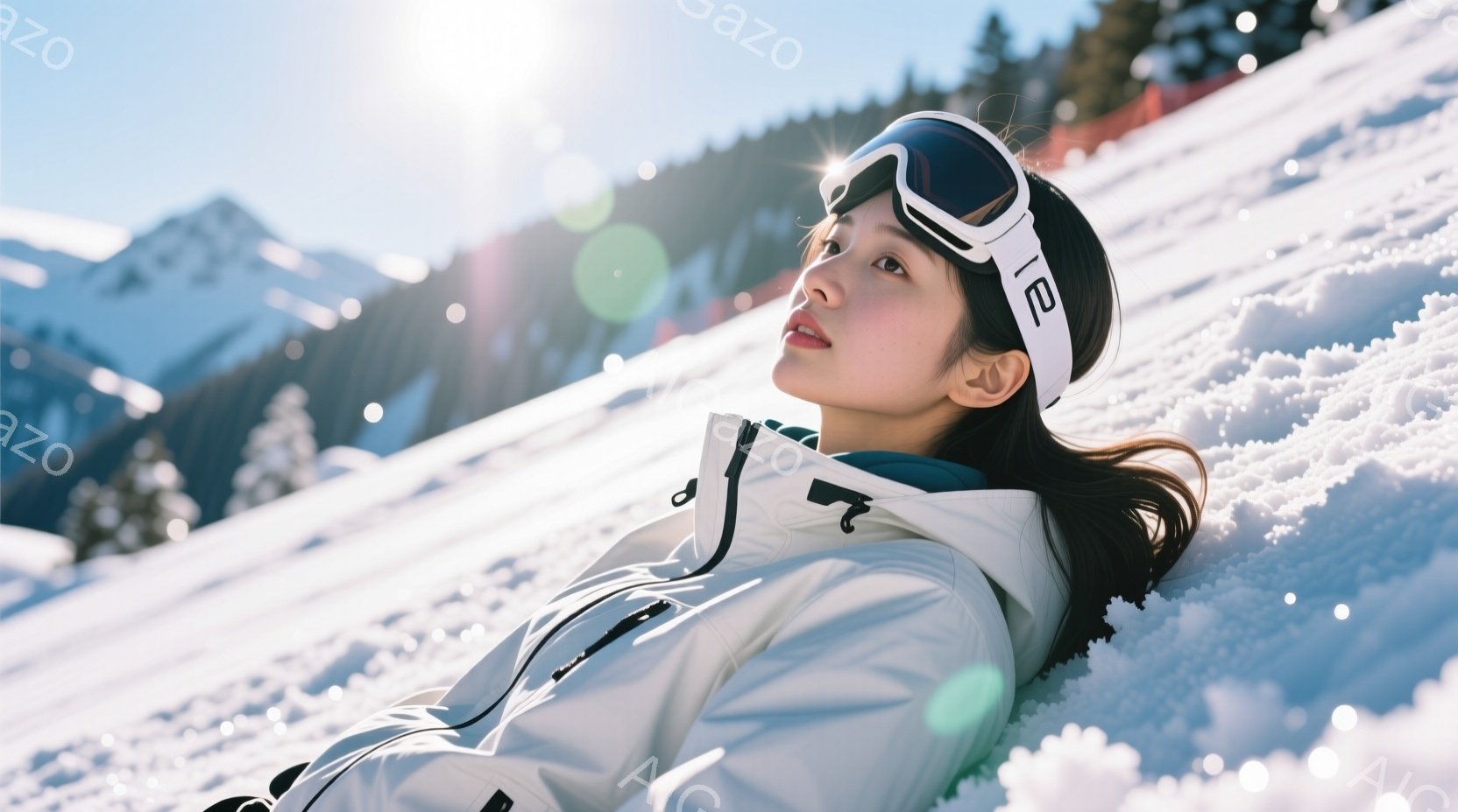 スキーウェアの青いジャケットを着た女性が雪の上に仰向けに寝ています。彼女は黒い髪を後ろでまとめており、白いゴーグルをかけて、少し上を見ている穏やかな表情をしています。背景には雪山が広がっており、晴天で明るい日差しが降り注ぎ、冬の爽やかな雰囲気を醸し出しています。