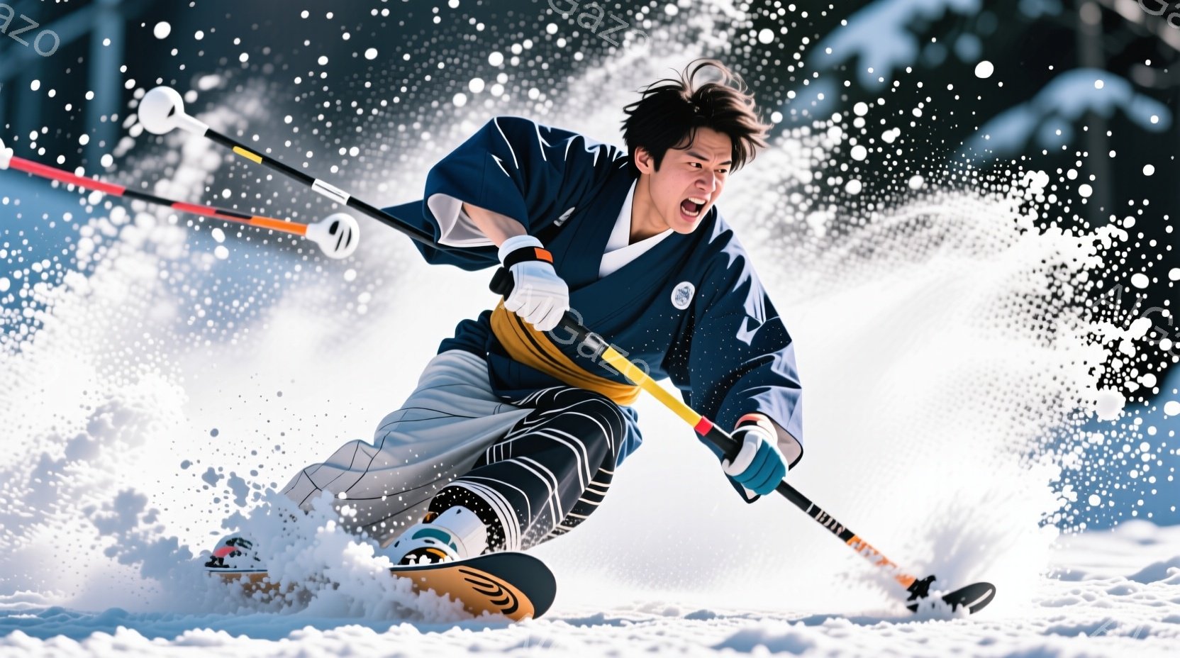 雪の上をスキーで疾走する男性が写っている。彼は時代劇風の着物と袴を身につけ、黒髪を無造作に後ろに撫でている。表情は真剣で、勢いよく滑る姿からスピード感と躍動感が伝わってくる。