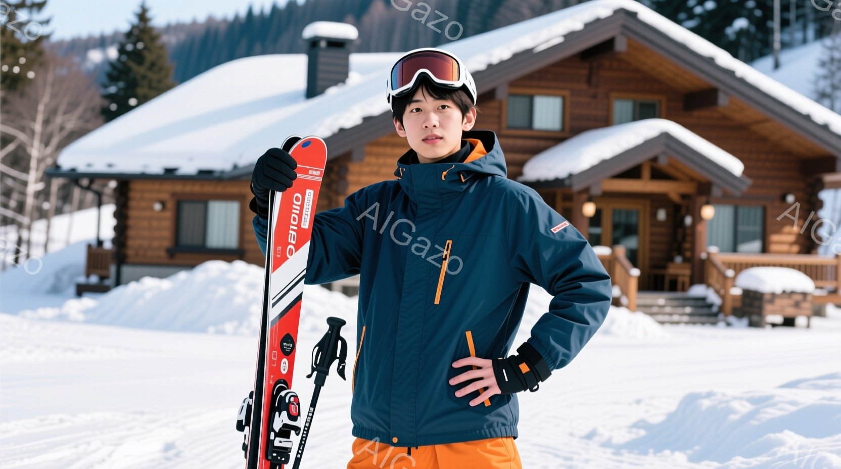 雪景色の中に立つ男性が写っています。彼は黒のスキーウェアにオレンジ色のラインが入っており、ゴーグルを頭に乗せ、片手にスキー板を持っています。背景には木造の建物が見え、雪が降る冬のスキーリゾートの雰囲気が漂っています。