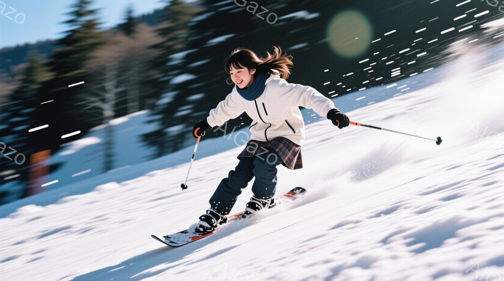 画像はスキー場で滑走する少女を捉えています。彼女は白いジャケットとチェック柄のスカート、黒いレギンスを身につけ、黒い髪を後ろで結んでいます。背景には雪に覆われた木々と青空が広がり、晴れた日のスキーを楽しんでいる様子が伝わってきます。