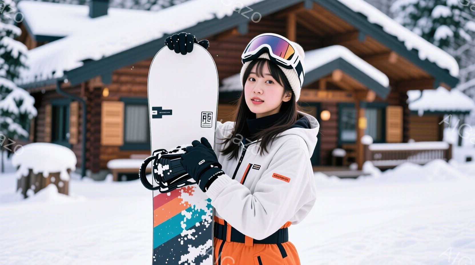 スノーボードとグローブを持った女性が写っています。彼女は白いパーカーと黒いズボンを着用し、ヘアスタイルはポニーテールです。背景には雪に覆われた木造の建物があり、雪が降る冬の風景が広がっています。