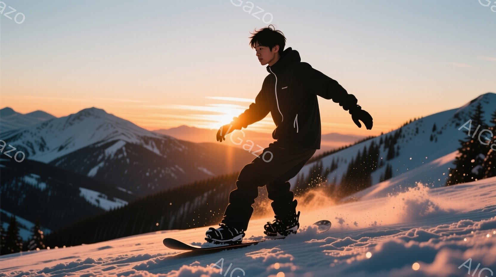 若い男性がスノーボードに乗って雪の上を滑っている様子が写っています。彼は青いジャケットと茶色のズボンを身に着け、黒い髪を少し無造作にしています。背景には雪に覆われた木々が見え、晴れた空から差し込む光が雪面を照らし出し、爽やかな冬の雰囲気を醸し出しています。