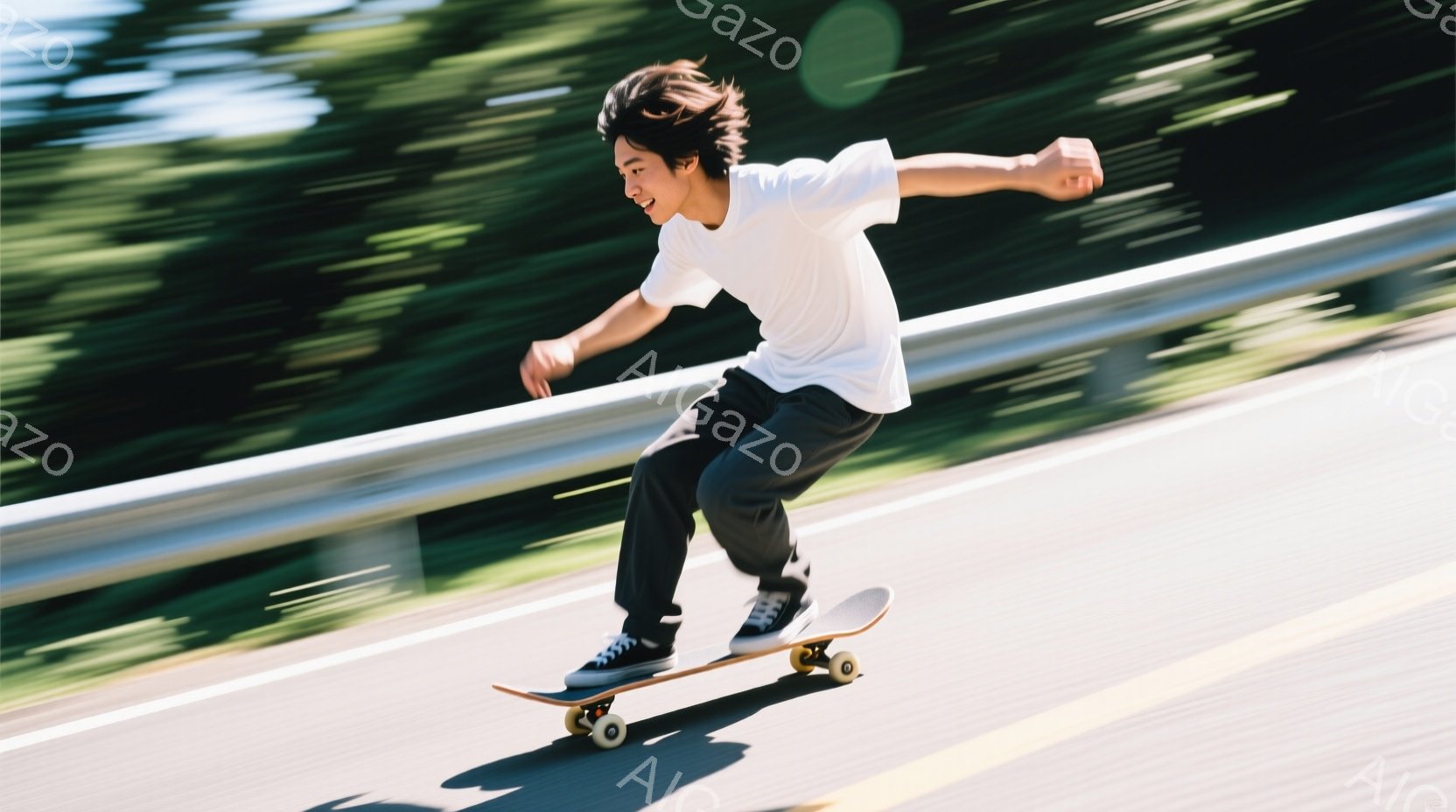 この無料AI生成画像「白いTシャツと黒いパンツを身につけた若い男性が、道路の上でスケートボードに乗っている様子が写っている。彼は少し前かがみの姿勢で、両腕を広げてバランスを取っており、顔には楽しそうな笑顔が浮かんでいる。背景には緑豊かな丘と青い空が見え、天候は晴れで、スピード感と爽やかな雰囲気が伝わる。」は、2025年10月23日に作成されました。 サイズは 1664×928px の高解像度で、商用利用も可能なフリー素材として提供しています。