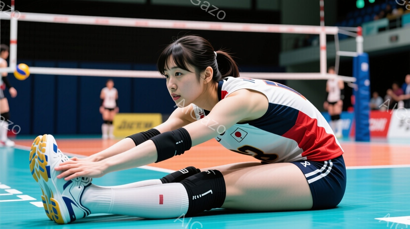 バレーボール選手と思われる女性が床に座り、開脚ストレッチをしている様子が写っている。彼女は赤い、白い、青いストライプのユニフォームと黒いリストバンド、ニーパッドを着用し、髪は後ろでポニーテールに結んでいる。背景にはバレーボールコートがあり、他の選手やネットが見え、競技場の活気ある雰囲気が感じられる。