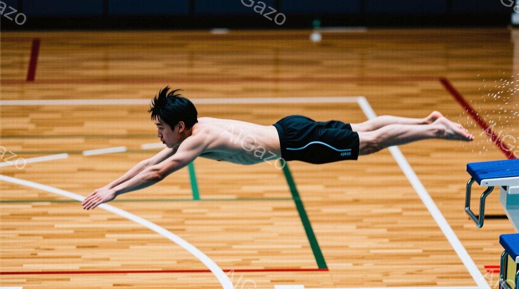 水泳競技中の男性が写っている。彼は黒い競泳用水着を着用し、黒髪を濡らして前方に伸ばしたポーズで、空中で体を水平に保っている。背景は木製の床と青いラインが走り、競技施設内であることがわかる。