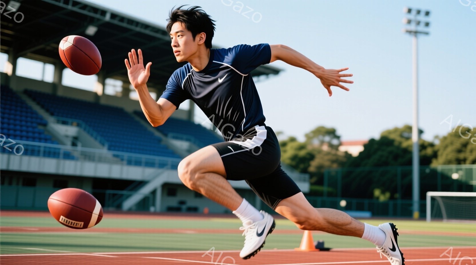 競技場を疾走する男性の姿が写っている。彼は黒と青のストライプが入ったスポーツウェアと黒いソックス、白いスニーカーを着用し、髪は短く整えられている。背景には緑の芝生、オレンジ色のコーン、そしてぼやけた緑の木々が見え、晴天の下、活気のある競技場の雰囲気が伝わってくる。