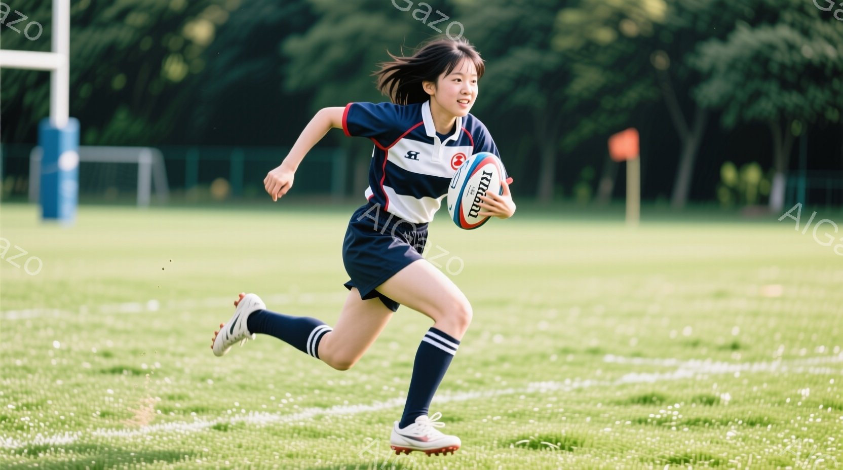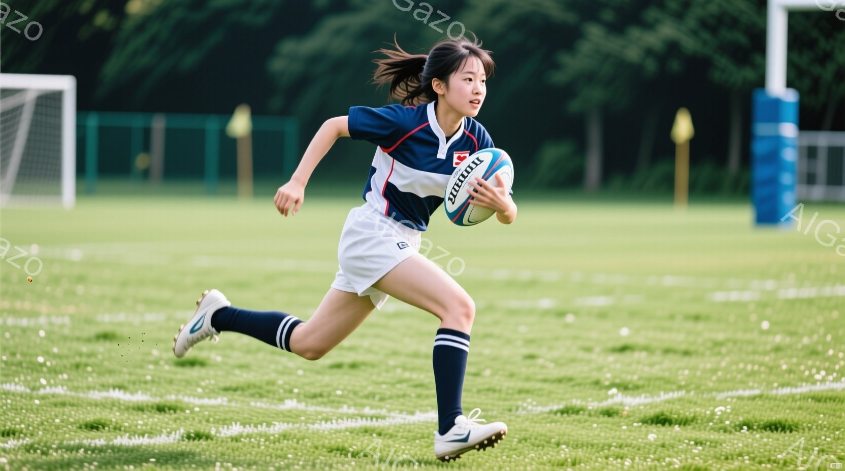 紺と白のストライプのラガーシャツに白いショートパンツ、濃い青色のソックスと白のスニーカーを履いた若い女性が、緑の芝生の上をボールを持って走っている。彼女は髪をポニーテールにし、集中した表情で前を見据えている。背景にはサッカーゴールと緑豊かな木々が見え、晴れた日の屋外スポーツの活気ある雰囲気が漂っている。