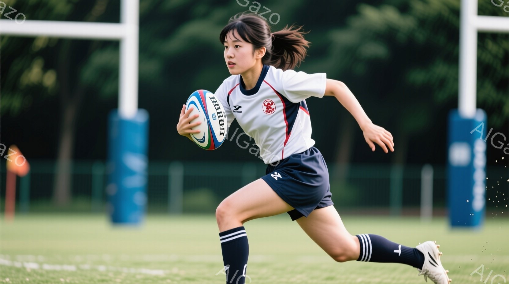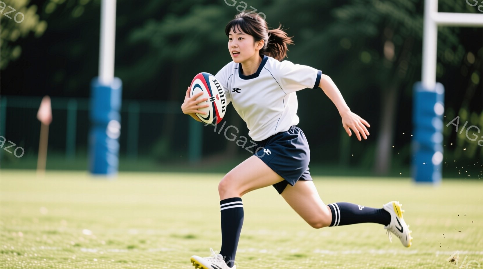 ラグビーボールを持つ若い女性が、緑の芝生の上を力強く走り抜けている。紺色の膝丈ソックスとショートパンツ、白と紺のストライプのラグビージャージ、そして白いスニーカーを身に着けており、髪はポニーテールに結ばれている。背景にはサッカーゴールが見え、青空の下、晴れた日の屋外で活気のあるスポーツの瞬間を捉えている。