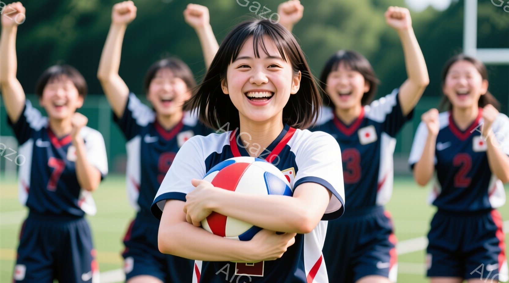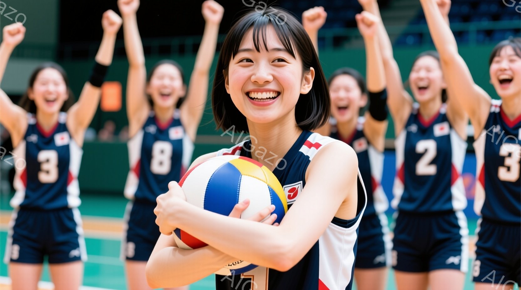 この無料AI生成画像「バレーボール選手と思われる女性たちが、勝利を祝うように笑顔でポーズをとっています。赤いラインと青い部分が入ったジャージを着ており、髪型はポニーテールで、膝下にはサポーターをつけています。背景は体育館で、ネット越しに見える他の選手たちの姿もあり、全体的に活気があり、明るい雰囲気が伝わってきます。」は、2025年10月23日に作成されました。 サイズは 1664×928px の高解像度で、商用利用も可能なフリー素材として提供しています。