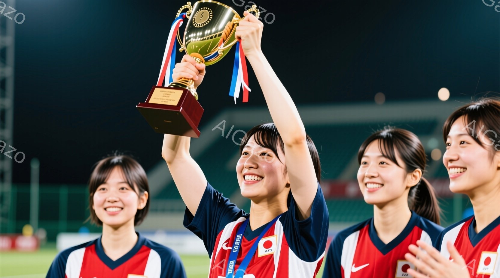 赤いシャツと白いズボンを着用した日本の女性サッカー選手たちが写っています。彼女たちは皆、勝利のトロフィーを高く掲げ、満面の笑みを浮かべています。背景は夜のスタジアムで、観客席の明かりがぼんやりと見え、勝利の喜びと興奮が伝わってきます。