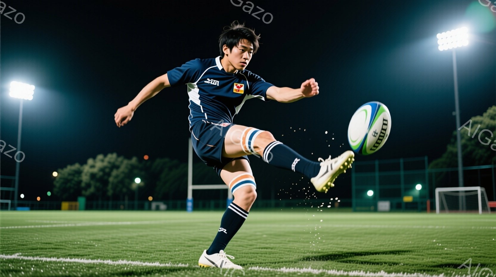この無料AI生成画像「ラグビー選手がキック動作をしている写真です。紺色の襟付きシャツに黒の短パン、黄色のソックスとスパイクを履き、髪は短く整えられています。背景には緑の芝生、遠くに建物の明かりが見え、夜間の屋外ラグビー場の雰囲気です。」は、2025年10月23日に作成されました。 サイズは 1664×928px の高解像度で、商用利用も可能なフリー素材として提供しています。