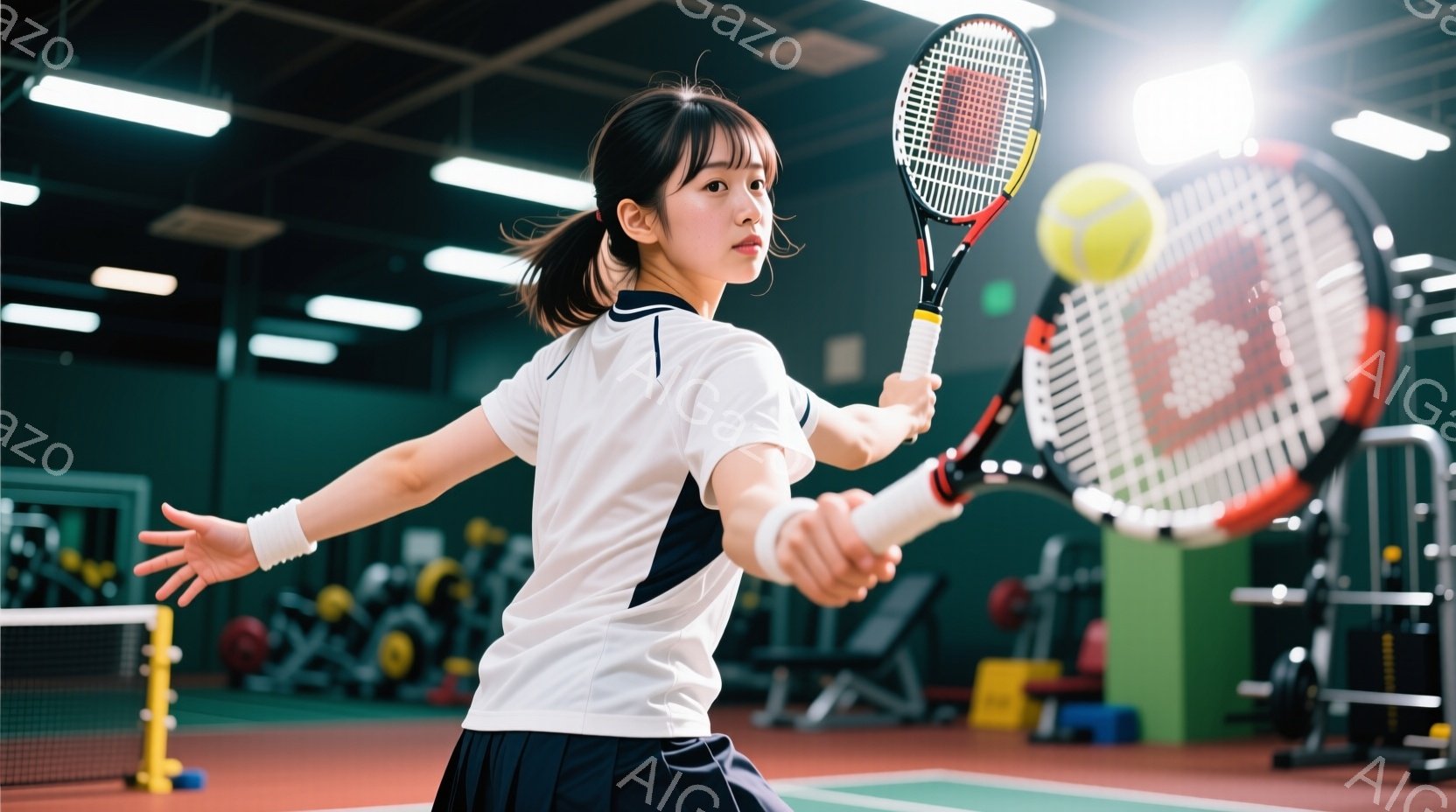 この無料AI生成画像「屋内テニスコートで、若い女性がテニスラケットを振りかぶり、ボールを打とうとしている瞬間を捉えた写真です。白いTシャツと紺色のショートパンツを着用し、髪は後ろでポニーテールにまとめています。背景には緑色の壁とネット、そして天井からの明るい照明が写り込み、集中した雰囲気の中でスポーツを楽しむ様子が伝わります。」は、2025年10月23日に作成されました。 サイズは 1664×928px の高解像度で、商用利用も可能なフリー素材として提供しています。