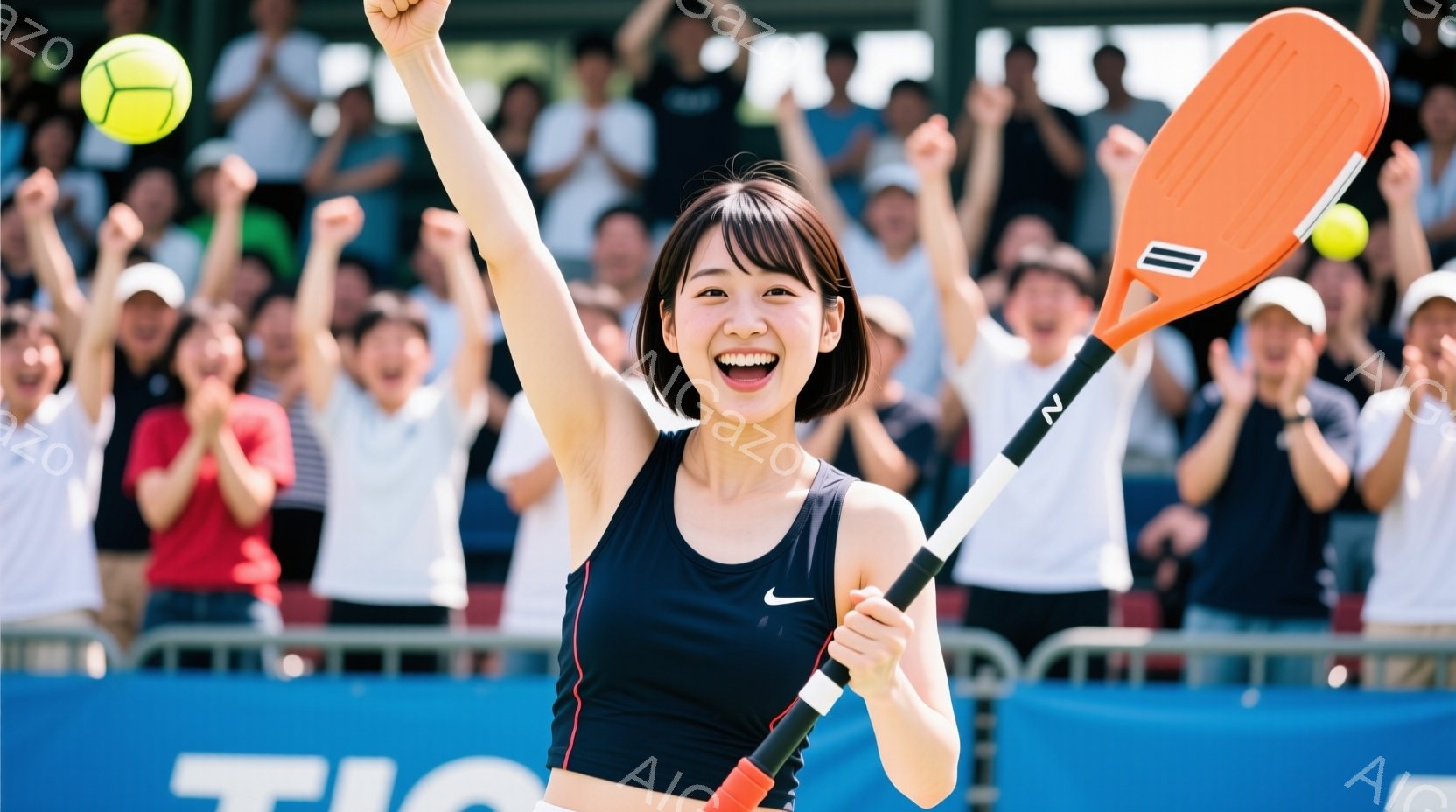 テニスウェアを着た若い女性アスリートが勝利を喜び、片手を高く上げている様子を捉えています。彼女は黒いヘアバンドで髪をまとめ、赤いラインが入った黒のタンクトップと黒いショートパンツを着ています。背景には、観客席と青い空が広がり、晴天の下でのテニスの試合が行われていることがわかります。