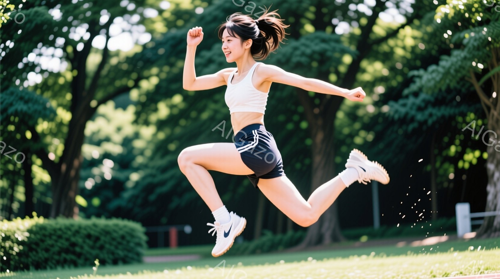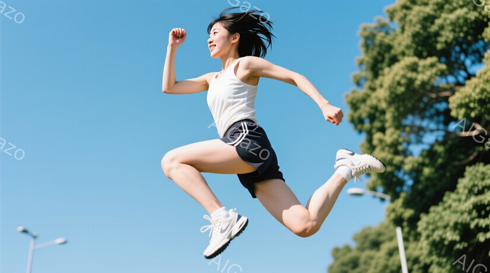 青空の下、女性がジャンプしている様子が捉えられた写真です。彼女は白いスポーツブラと紺色のショートパンツ、白いスニーカーを着用し、髪はポニーテールに結んでいます。躍動感あふれる姿勢と笑顔から、彼女の喜びと活力が伝わってきます。