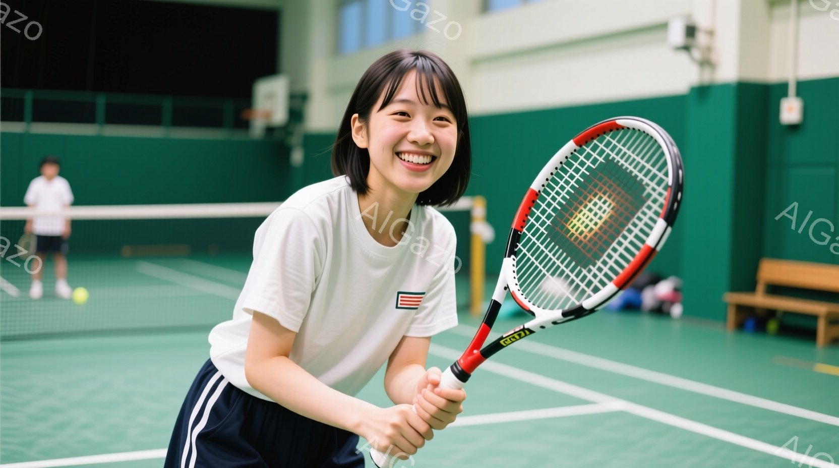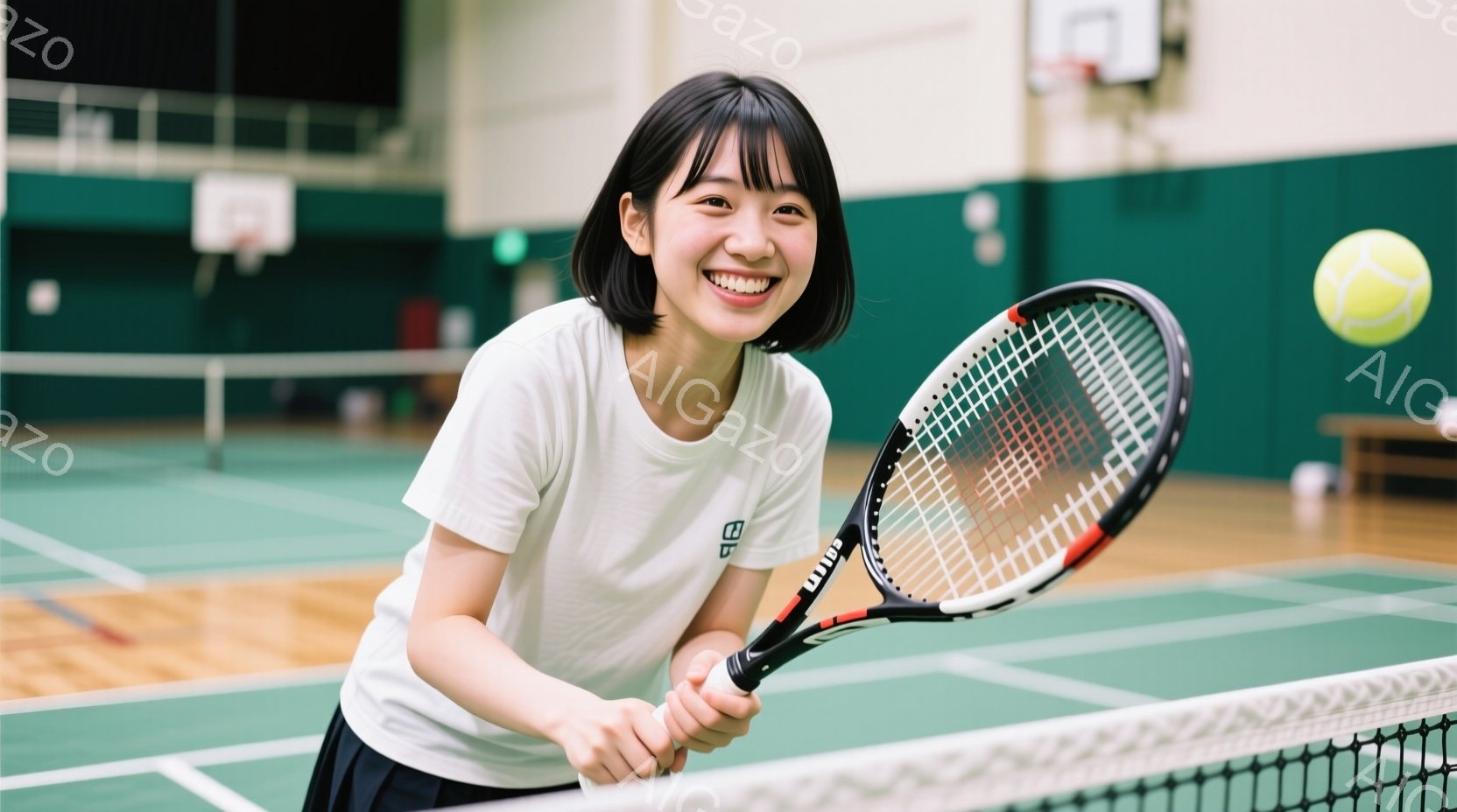 若い女性がテニスコートに立っており、白いTシャツと黒いショートパンツを着用しています。彼女は明るい笑顔を浮かべ、片手にテニスラケットを持っています。背景には緑色の壁とネット、そしてバスケットボールゴールが見え、屋内テニスコートの雰囲気です。