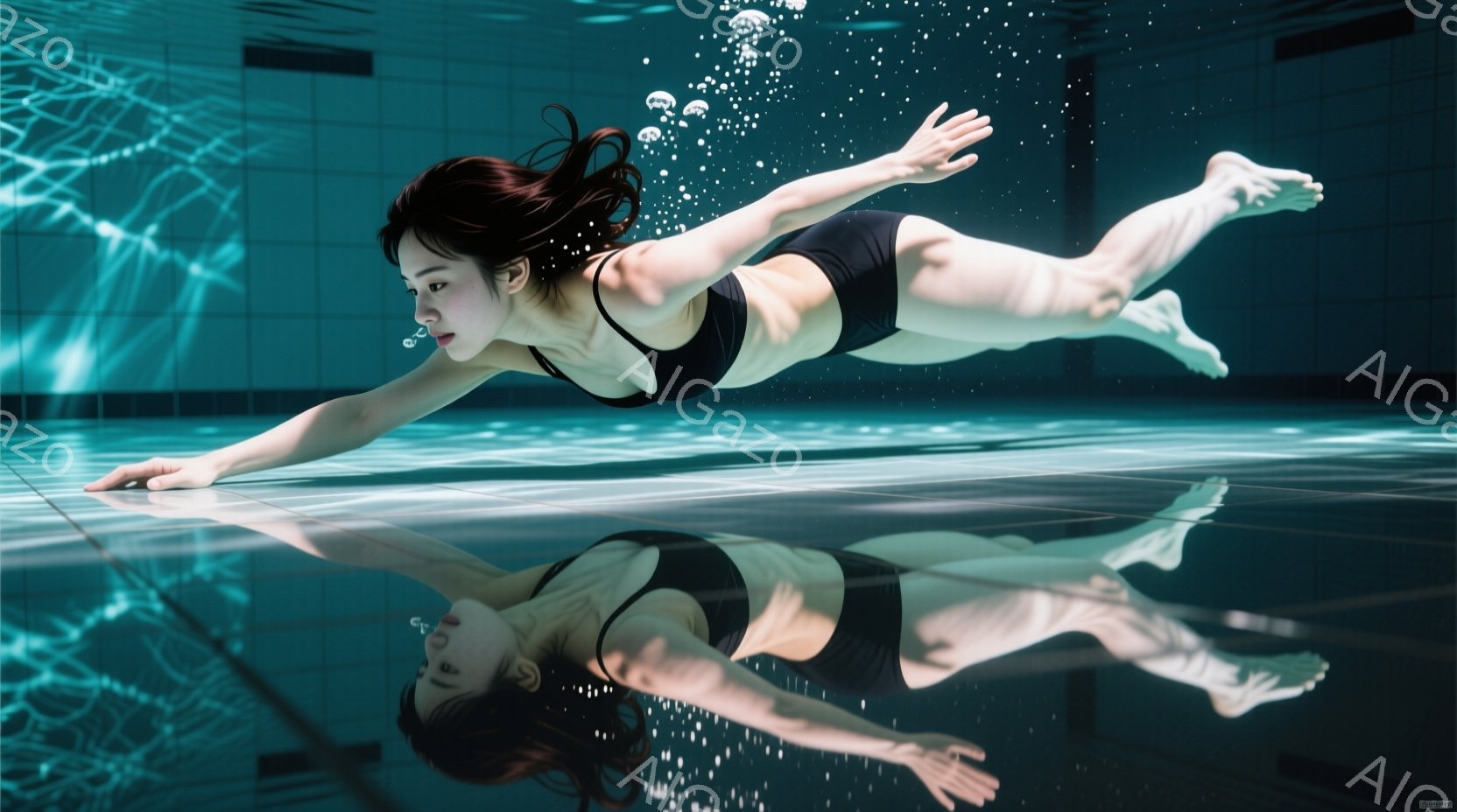 水中で水平に泳ぐ女性が写っている。彼女は黒い水着を着ており、髪は濡れて後ろに広がっている。背景は水中のタイルで、光が差し込み、幻想的な雰囲気を醸し出している。