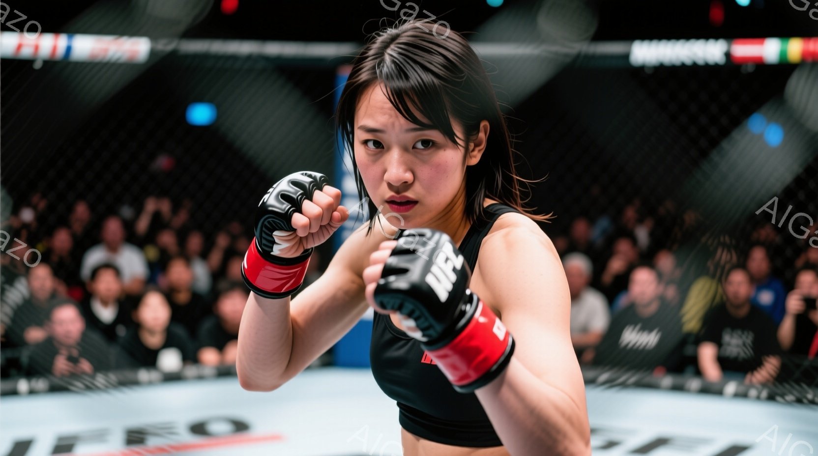 リングに立つ女性レスラーは、赤い装飾が施された黒いレオタードと膝サポーター、リストバンドを着用し、力強い表情で拳を握り締めています。彼女は片膝を曲げ、戦闘態勢に入っており、背景にはリングロープとぼやけた観客席が見えます。 全体的に、緊迫感と活気に満ちた競技の雰囲気が漂っています。