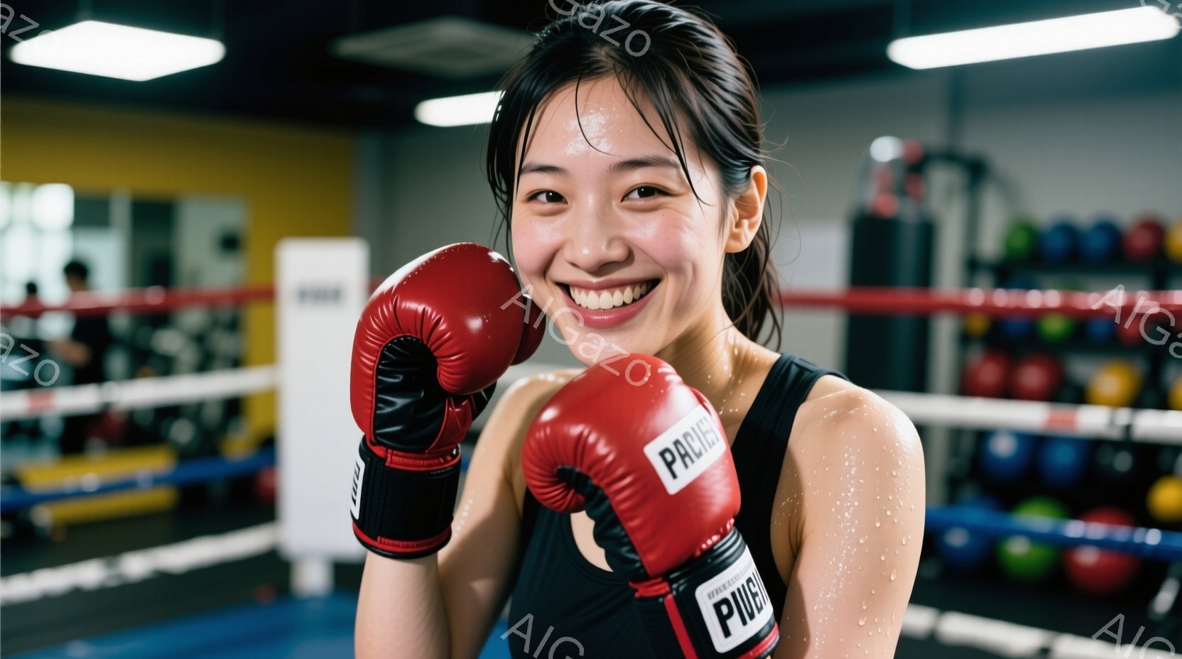 青いボクシンググローブを身につけ、満面の笑みを浮かべる女性が写っています。彼女は黒のタンクトップを着ており、髪は後ろでまとめています。背景には、ボクシングジムのリングとトレーニング器具が見え、活気のある雰囲気です。