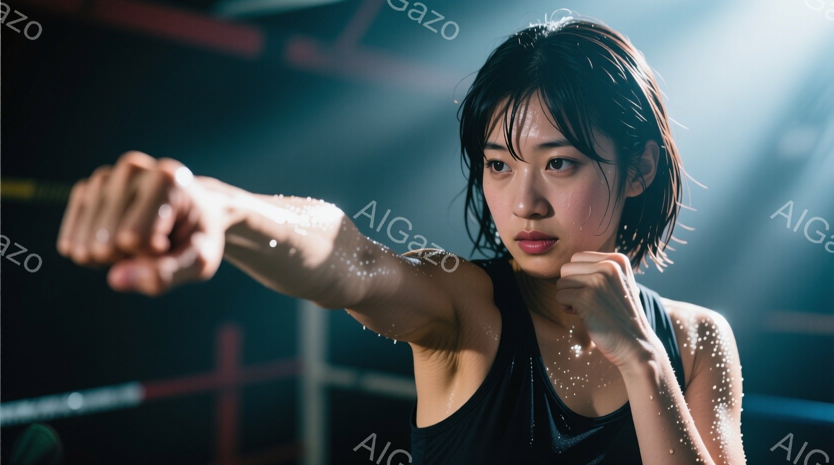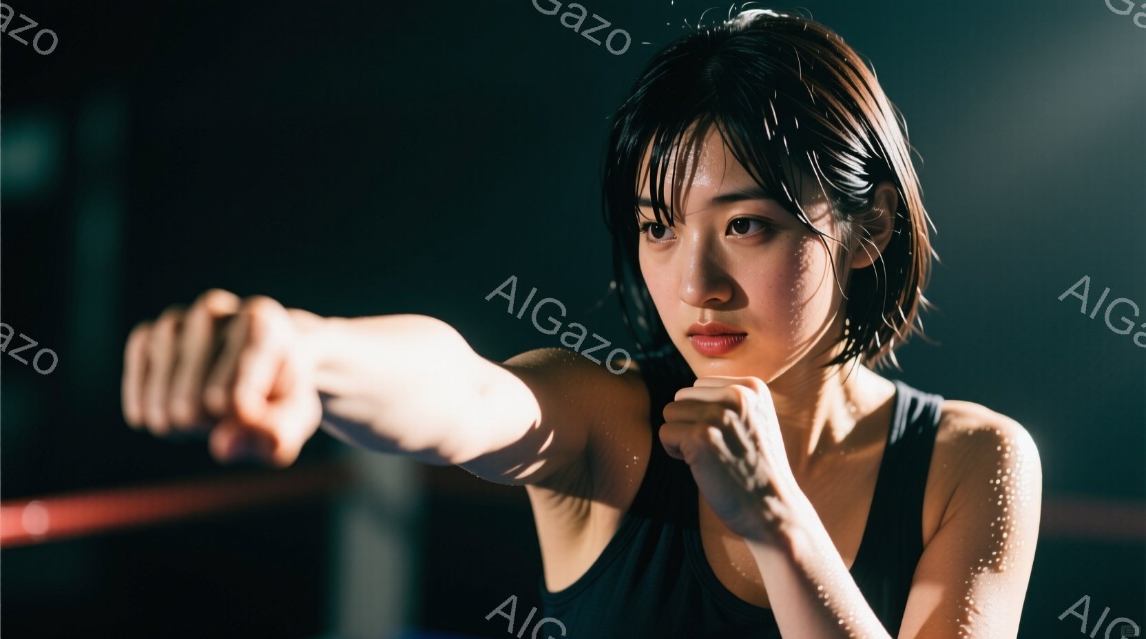 黒いタンクトップを着た若い女性がボクシングの構えを取っている様子を捉えています。彼女の髪は濡れて額に張り付き、顔には強い決意と集中力が表れています。背景は暗く、リングの一部が見え、彼女の力強い姿勢と運動能力を強調しています。