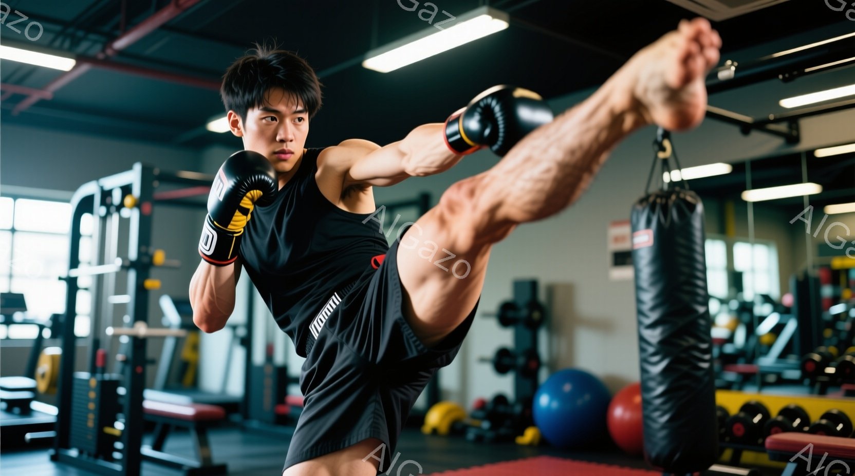 鍛え上げられた肉体を誇示する男性が、ハイキックを繰り出している瞬間を捉えた写真です。黒いショートパンツと、赤いラインが入ったグローブを身につけ、真剣な表情で一点を見据えています。背景にはジムのトレーニング器具が並び、集中したトレーニングの雰囲気が漂っています。