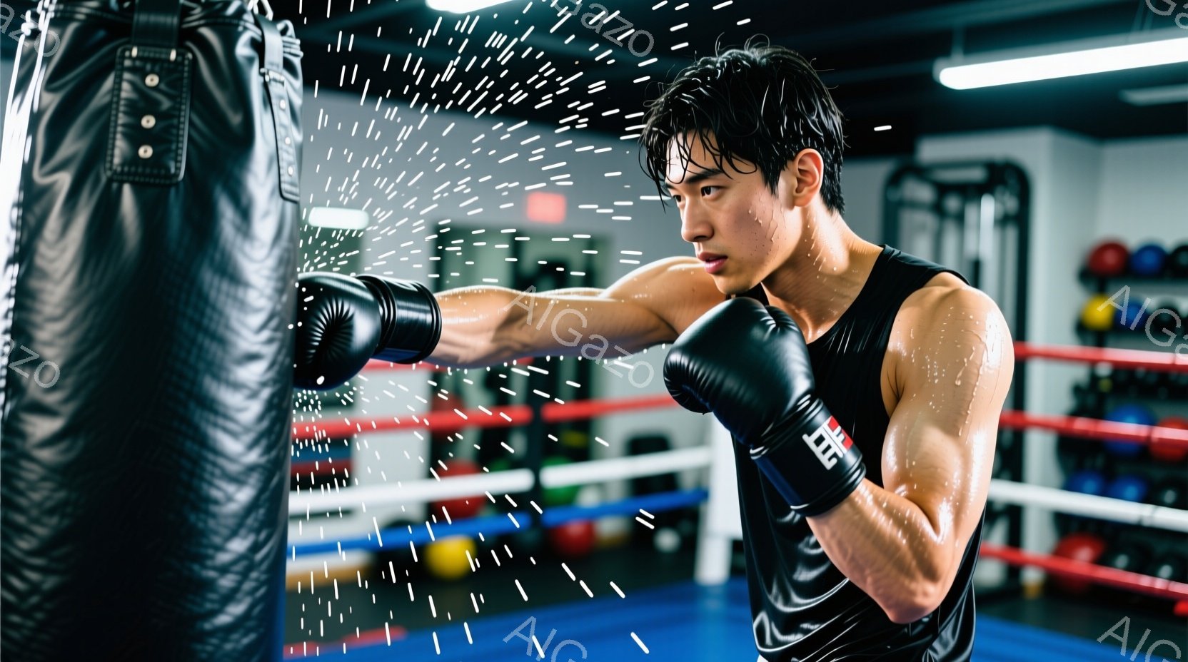 若い男性がボクシンググローブを着用し、パンチを繰り出す瞬間を捉えた写真です。汗が飛び散る様子から激しい運動の様子が伺えます。背景にはリングロープやサンドバッグが見え、ジムの様子がわかります。