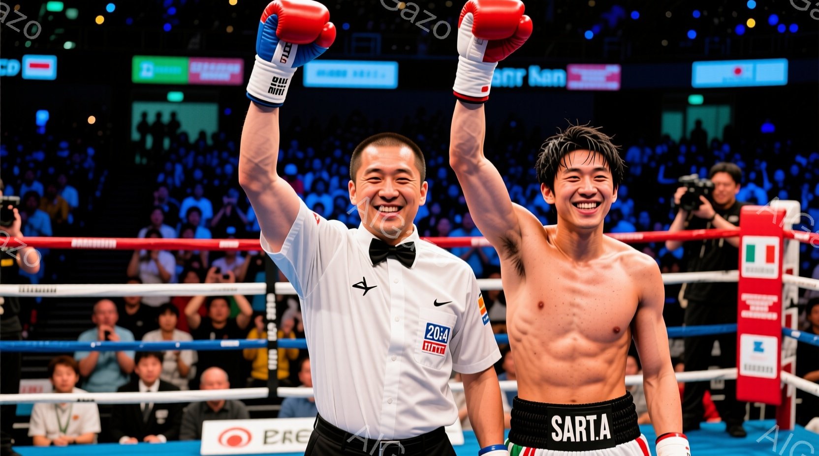 画像はボクシングリングに立つ男性を捉えており、彼は白いシャツに黒いネクタイ、黒いズボンを着用し、片手に赤いボクシンググローブをはめて勝利をアピールしています。彼は満面の笑みを浮かべ、右手を高く掲げ、自信に満ちた表情でカメラを見つめています。背景には観客席が広がり、多くの観客がリングを見守っており、興奮と熱狂的な雰囲気が漂っています。