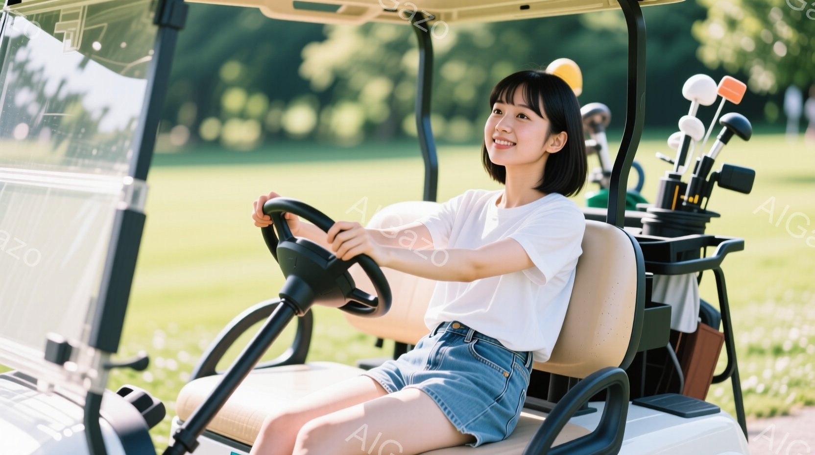若い女性ゴルファーが、ゴルフコース上で両腕を高々と上げ、満面の笑みを浮かべている。白いポロシャツに濃い紺色のパンツ、そしてゴルフグローブを着用しており、黒髪を耳にかけたヘアスタイルは爽やかさを演出している。背景には緑豊かなゴルフコースが広がり、晴天の下、勝利の喜びを表現した躍動感のある一枚である。