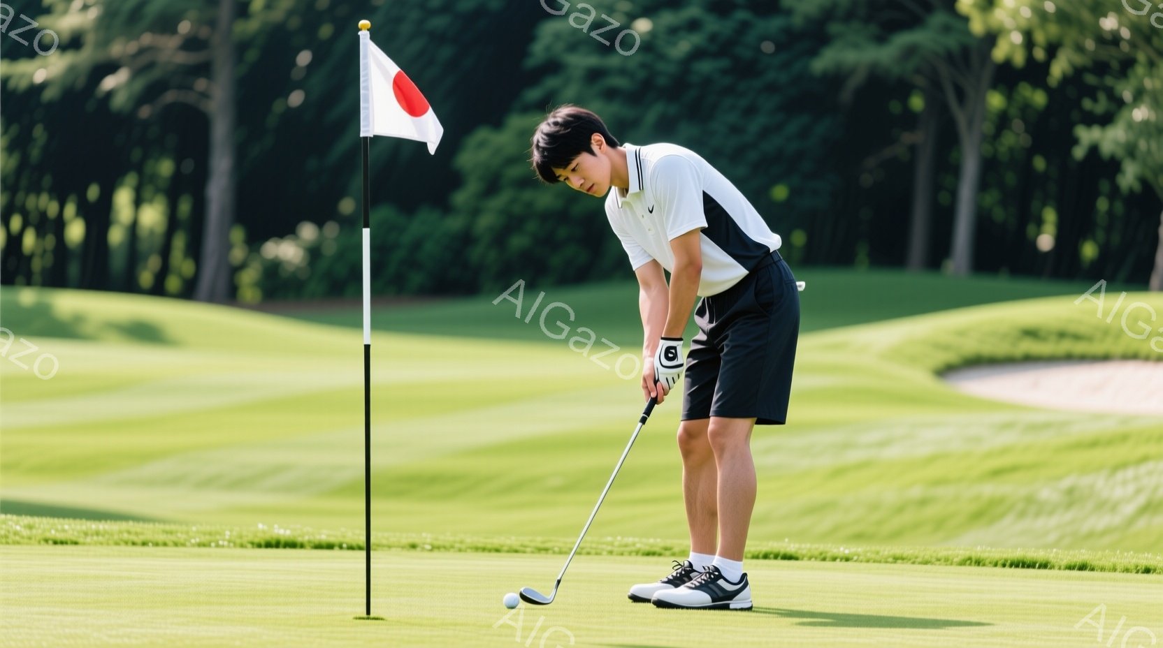 若い男性がゴルフのグリーンでパッティングをしている様子が写っている。彼は白いポロシャツ、紺色のショートパンツ、ゴルフシューズを着用し、黒いヘアスタイルで、集中した表情でボールを見つめている。背景には緑豊かなゴルフコースが広がり、旗竿と青空が確認でき、晴天の下でのゴルフを楽しんでいる様子が伝わる。