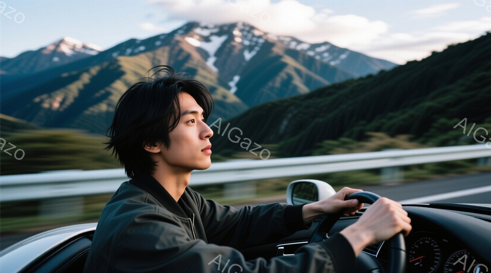 若い男性が、黒い革ジャンを着て運転している様子が写っている。彼は、少し横を向いて遠くを見つめ、落ち着いた表情をしている。背景には緑豊かな山々が広がり、晴天の下、開放的なドライブを楽しんでいる雰囲気が伝わってくる。