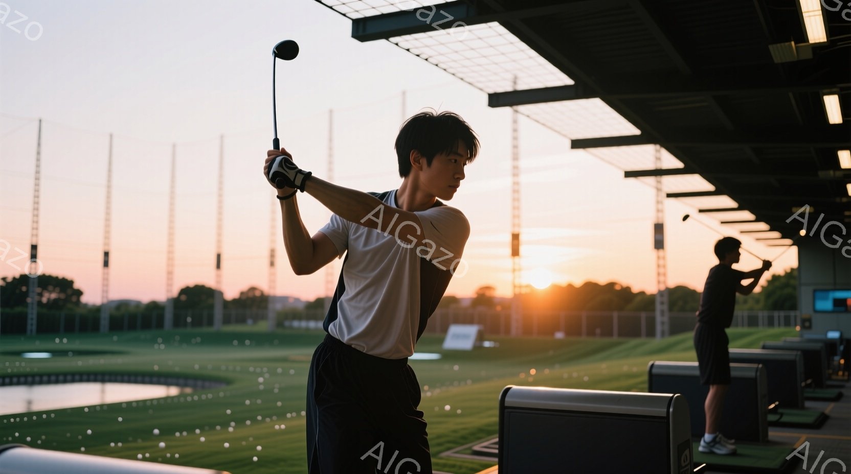 若い男性がゴルフ練習場でスイングしている様子が写っている。白と黒のストライプのシャツと黒いズボンを着用し、真剣な表情でゴルフクラブを振りかぶっている。背景には緑のゴルフコースと、夕焼けに照らされたオレンジ色の空が広がっており、練習場の屋根と照明も見える。