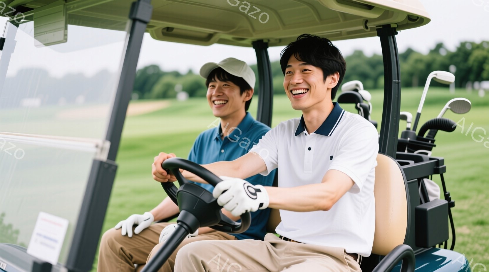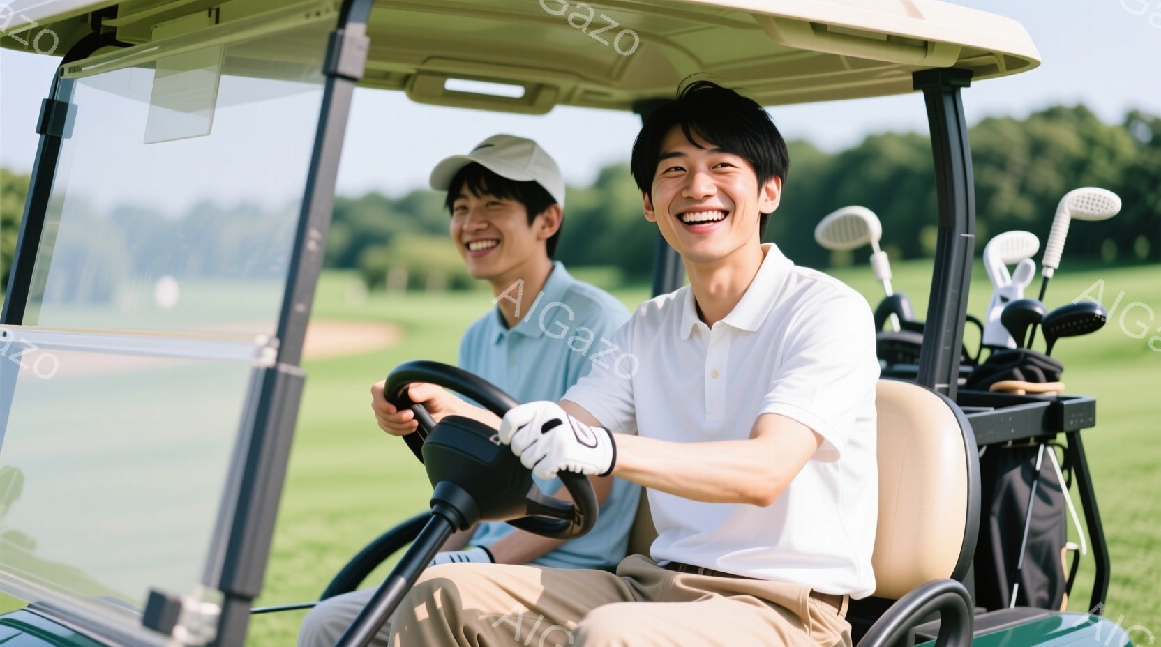 若い男性がゴルフカートを運転しており、白いポロシャツに濃い青色の縁取りが施され、カジュアルな服装をしています。彼は明るい笑顔を見せ、リラックスした姿勢でハンドルを握っています。背景には緑豊かなゴルフコースが広がり、晴れた日の穏やかな雰囲気が感じられます。