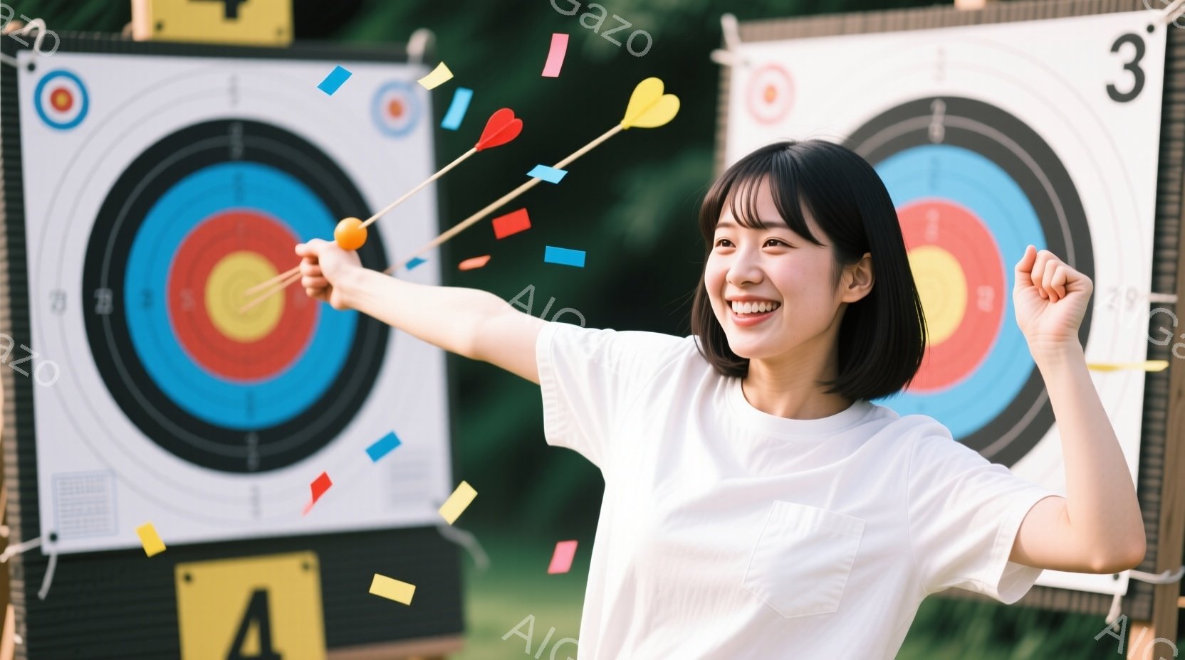 若い女性がダーツボードに向かってダーツを投げている姿が写っています。彼女は白いTシャツを着ており、前髪を下ろした短い髪型で、満面の笑みを浮かべています。背景には緑色の壁と他のダーツボードがあり、紙吹雪が舞い上がって、祝祭的な雰囲気を演出しています。