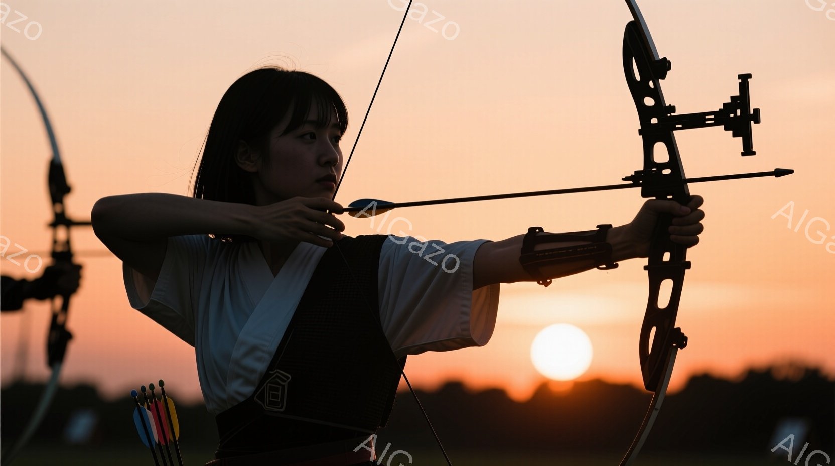 競技場で金メダルを首から下げ、笑顔を見せる女性アーチャーが写っている。白いスポーツウェアに赤いラインが入り、髪は後ろでハーフアップになっている。背景には観客席とアーチェリー競技場が広がり、明るく活気のある雰囲気が感じられる。