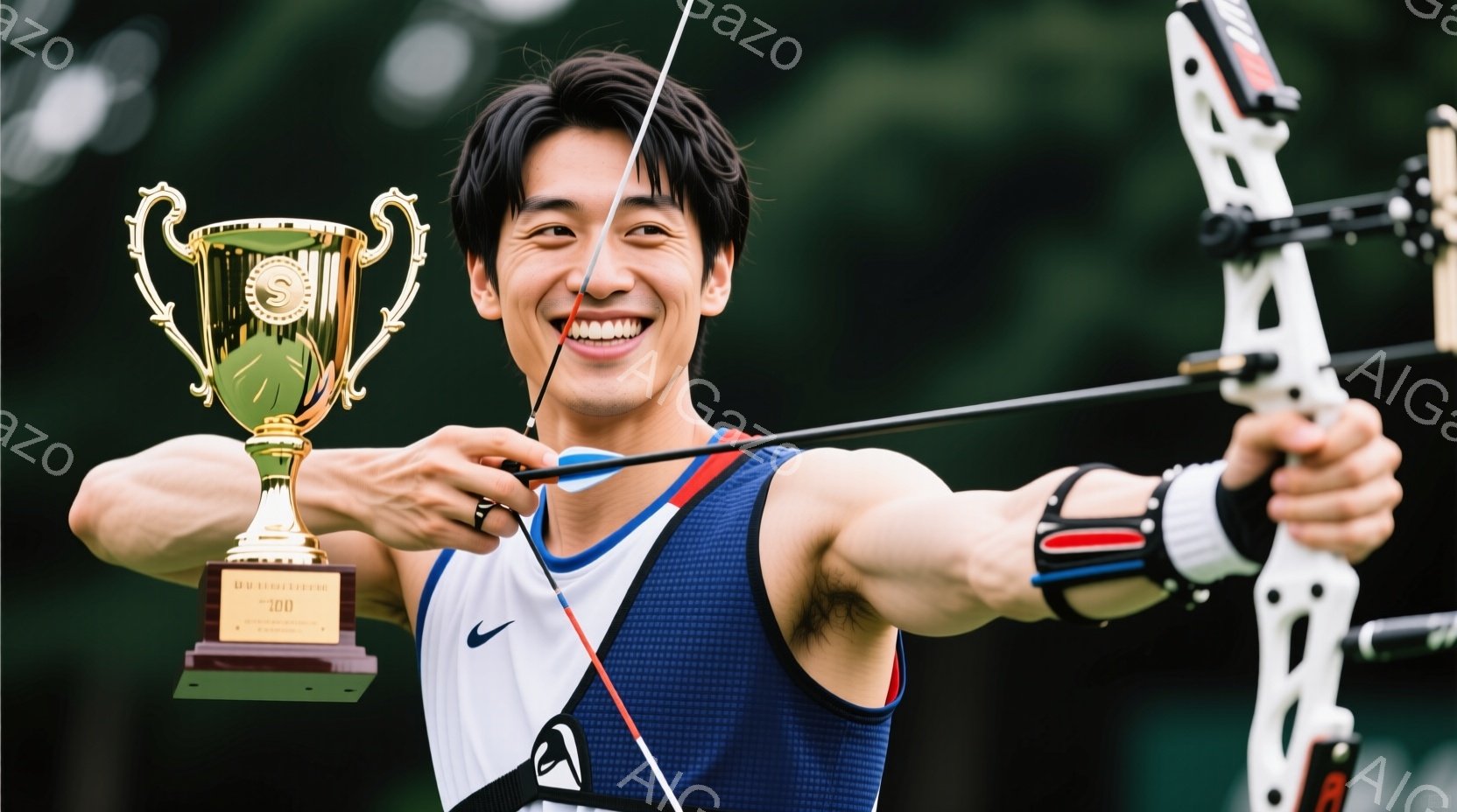 競技者が弓を引き絞り、ターゲットに向けて射撃の構えを取っている写真です。彼は紺色のユニフォームに赤いバンダナを着用し、笑顔でトロフィーを抱えています。背景には観客席と青空が見え、競技場の明るく活気のある雰囲気が伝わってきます。