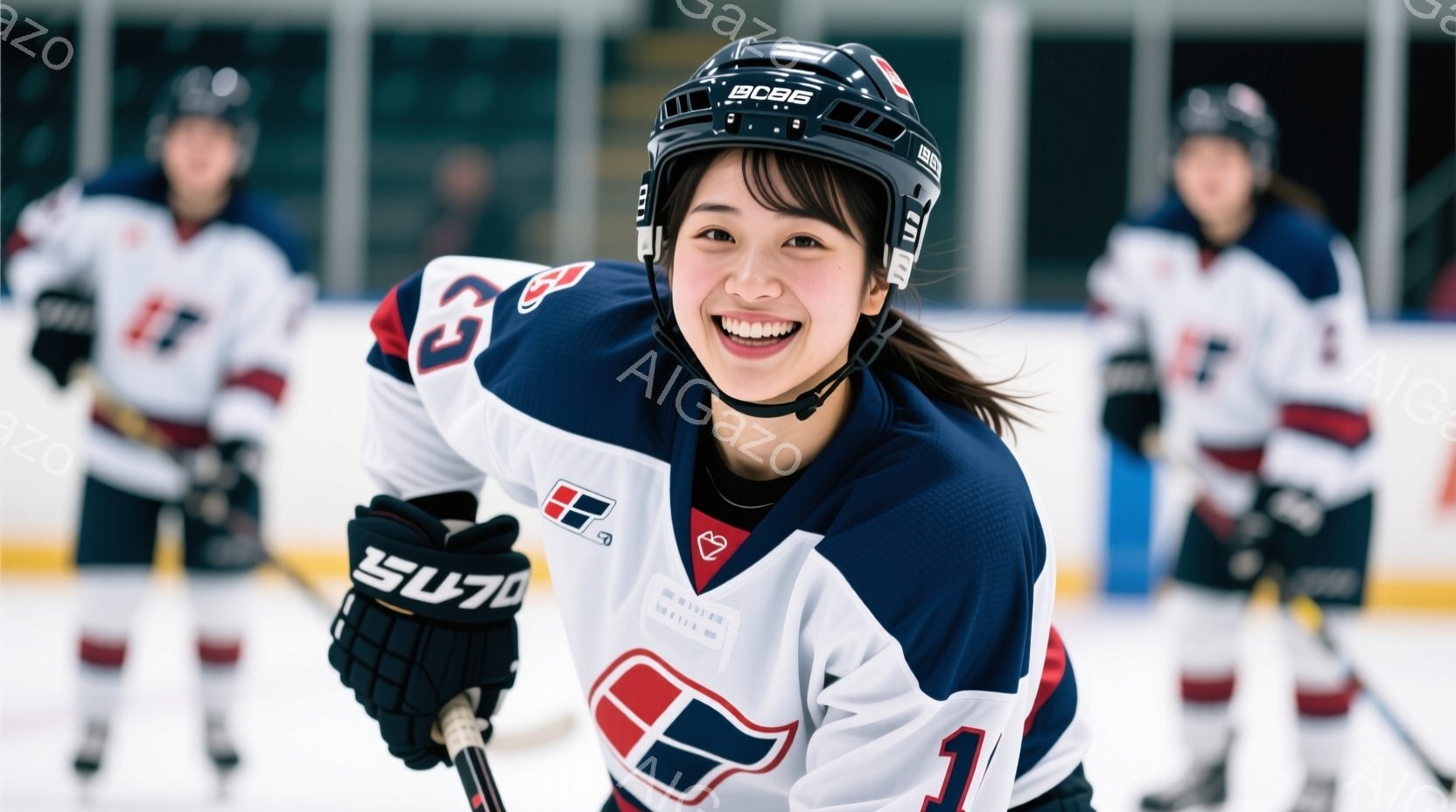 アイスホッケーの選手が笑顔で写っています。紺色のユニフォームとヘルメットを着用し、ホッケーのスティックを手に持っています。背景には他の選手たちがおり、アイスホッケーリンクで練習している様子がうかがえます。