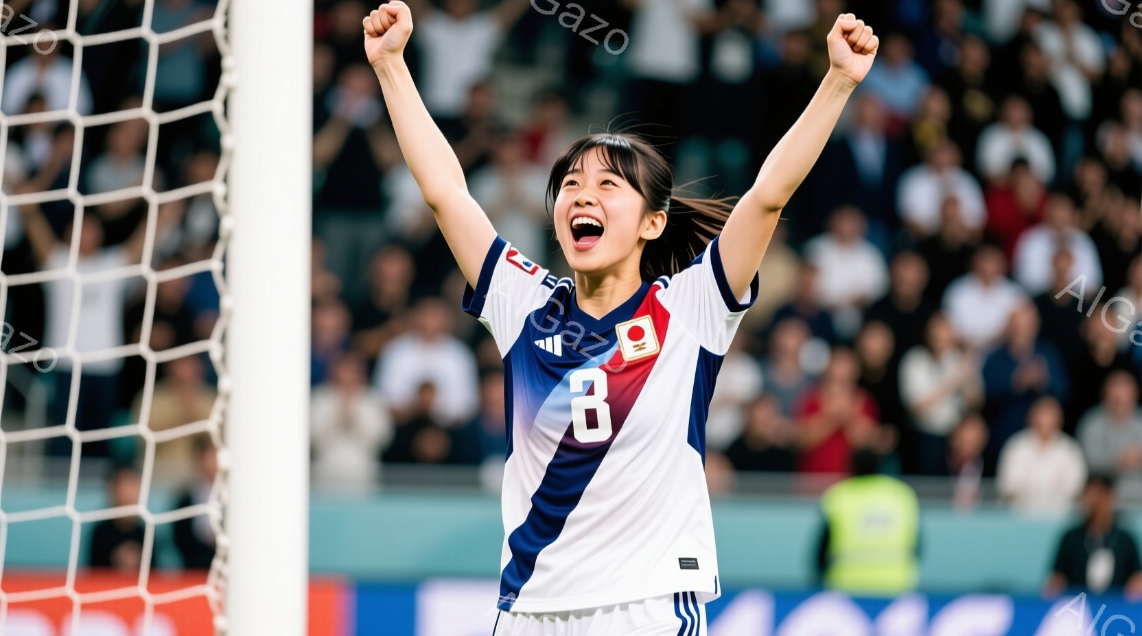 彼女は日本のユニフォーム(白地に赤と青のライン、背番号11)を着て、両手を高く挙げ、歓喜の表情を浮かべている。髪はポニーテールにしており、背景には観客席とサッカーのゴールネットが見え、活気に満ちた試合の雰囲気が伝わる。彼女の姿勢は勝利を祝い、興奮と喜びに満ち溢れている。