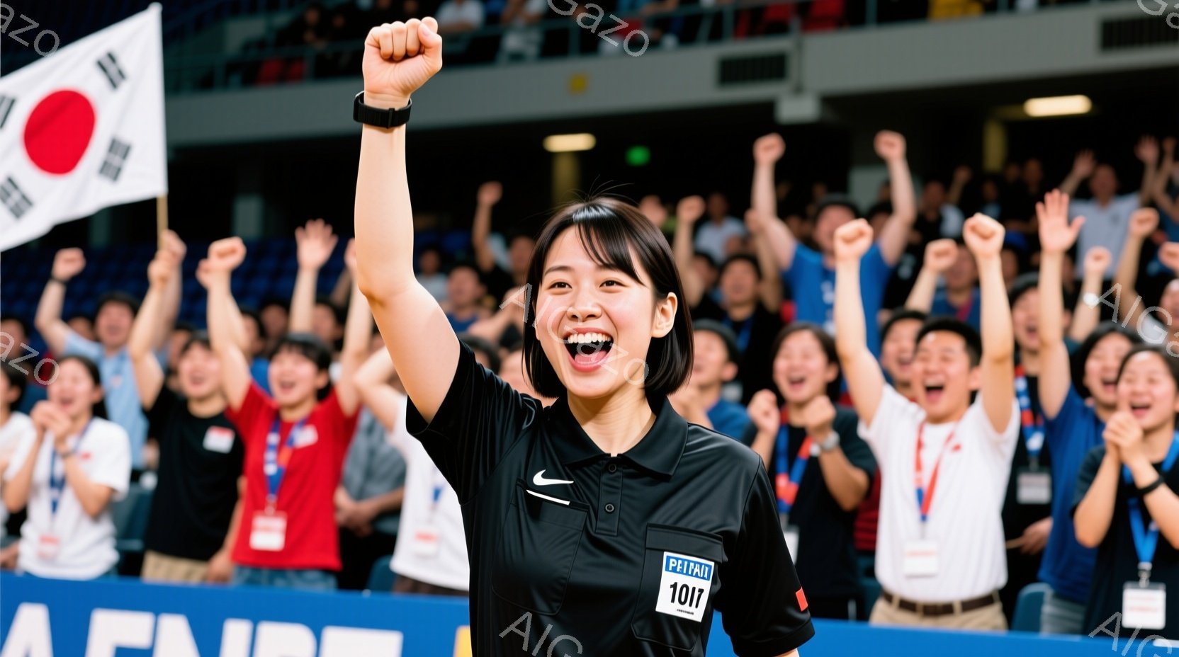 審判員と思われる女性が、満員の観客席の前で腕を高く上げて歓喜している様子が写っている。彼女は黒い制服を着ており、髪はポニーテールにまとめられている。背景には、日本の国旗や応援旗を持つ観客が写り、スタジアム全体が熱狂的な雰囲気に包まれている。