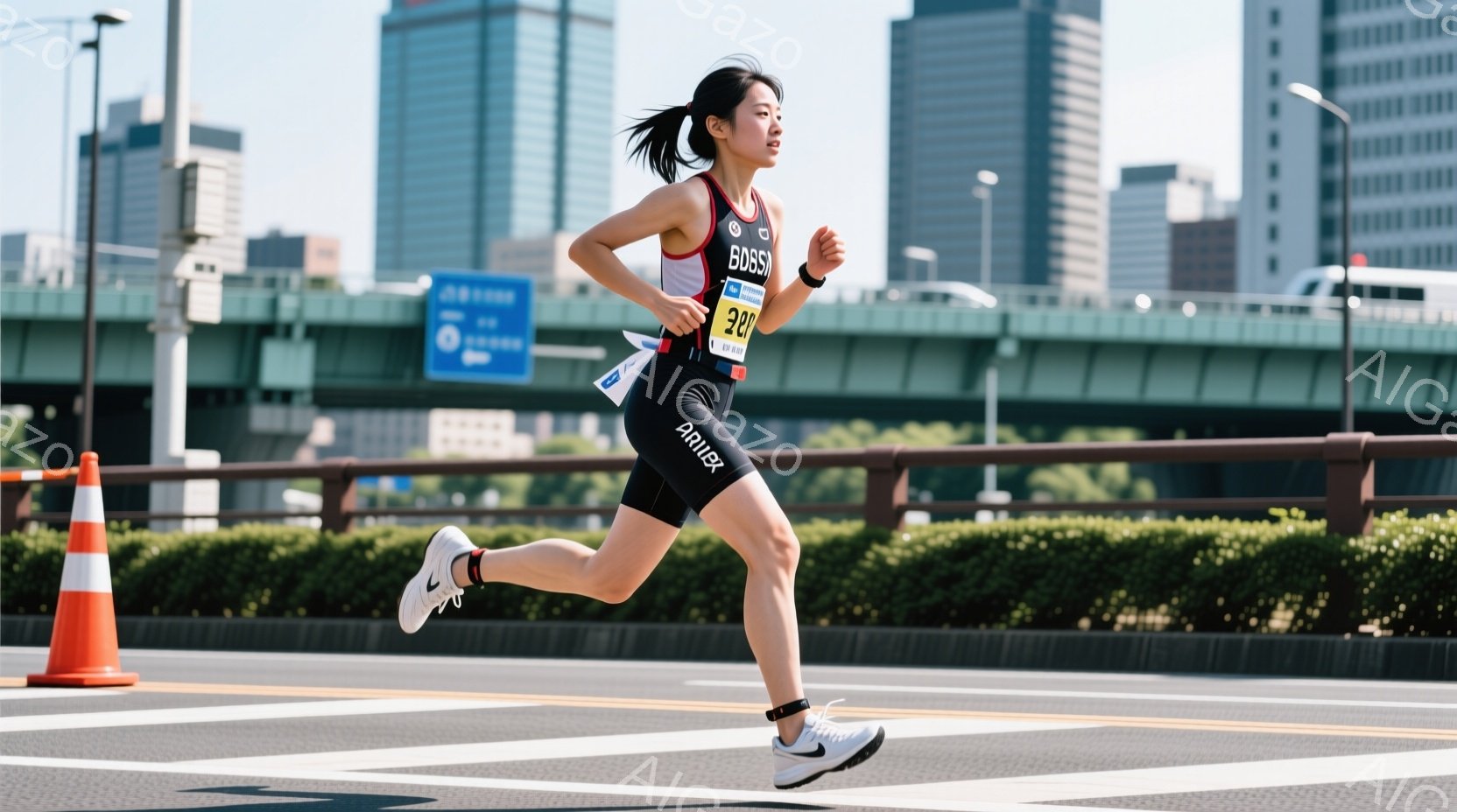 競技者が道路を走っている写真です。彼女は黒と青のトライアスロンウェアを着ており、髪はポニーテールに結ばれています。背景には高層ビルや木々が見え、晴天のもとで競技が行われている様子が伺えます。