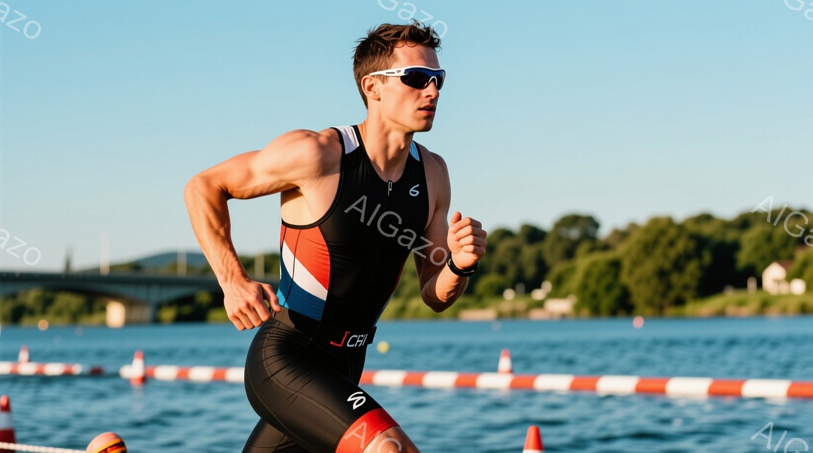 トライアスロン選手と思われる男性が、湖沿いの道路を走っている写真です。黒いトライスーツに、鮮やかな緑色のランニングシューズを履き、集中した表情で前を見据えています。背景には穏やかな湖と、緑豊かな山々が広がっており、晴天の下で活気のある雰囲気が漂っています。