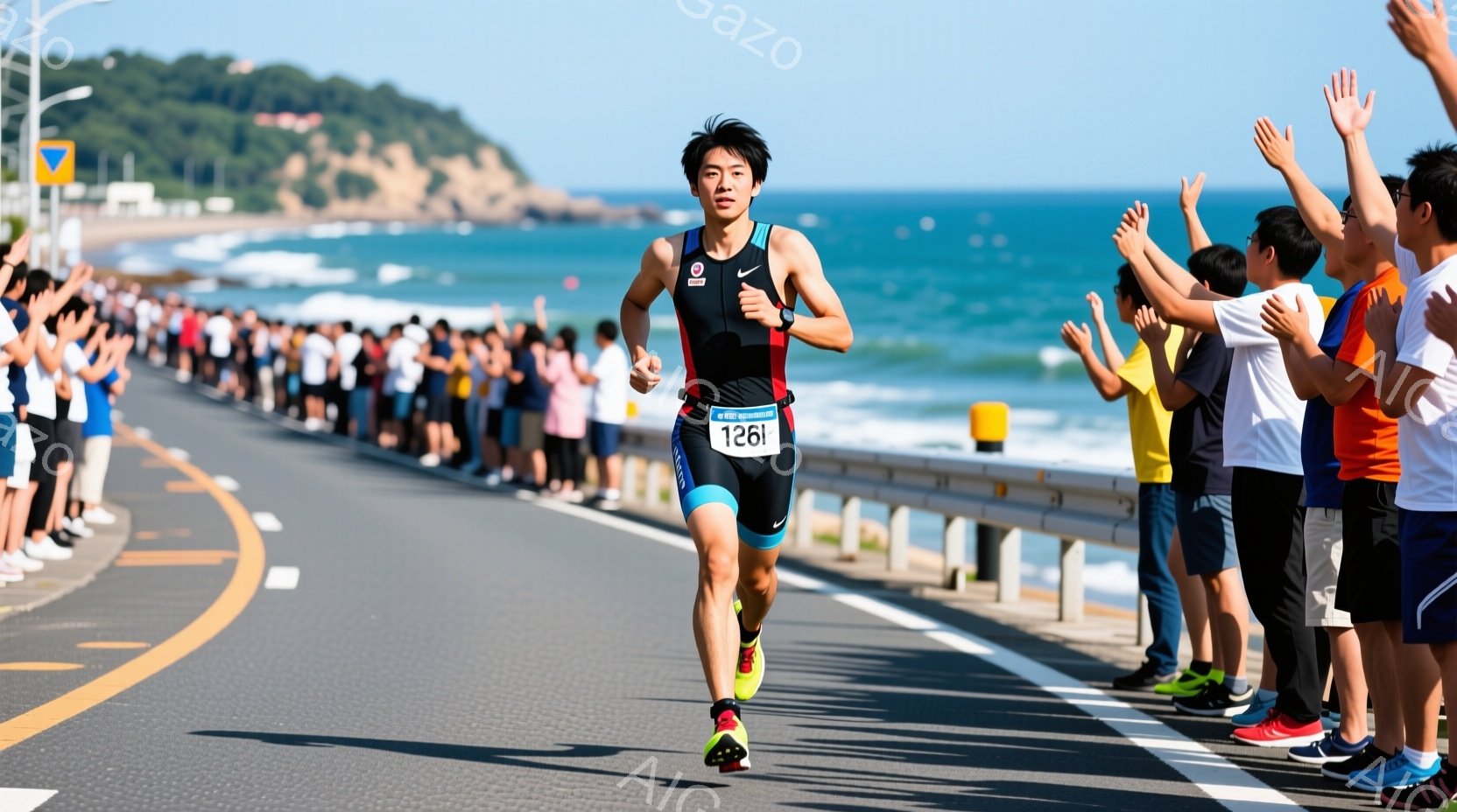 この無料AI生成画像「トライアスロンの競技者が海岸沿いの道路を走っている様子が写っている。競技者は黒のトライスーツを着用し、鮮やかな緑色のシューズを履いている。背景には青い海と空、そして観客が手を挙げて応援している様子があり、全体的に活気に満ちた競技の雰囲気が伝わる。」は、2025年10月23日に作成されました。 サイズは 1664×928px の高解像度で、商用利用も可能なフリー素材として提供しています。