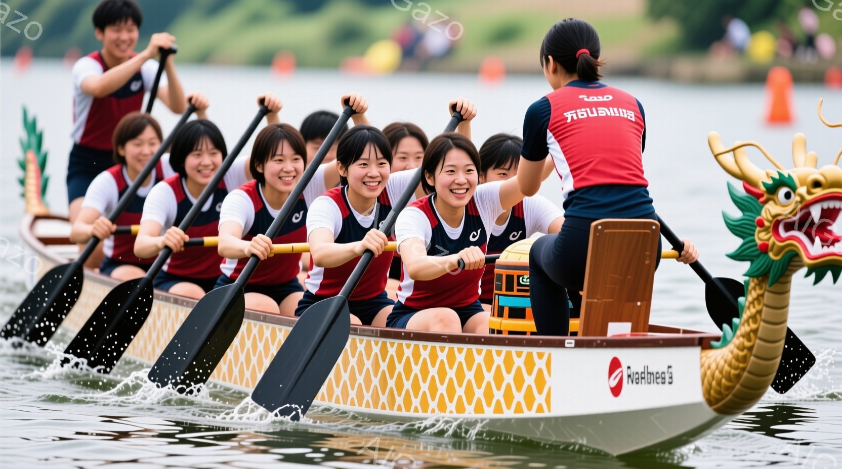 カヌーに乗った女性は、赤いライフジャケットと白いタンクトップを着ており、髪は後ろでポニーテールに結ばれています。彼女は真剣な表情でオールを漕ぎ、カヌーは水面を切り裂いて進んでいます。背景には穏やかな水面と緑豊かな自然が広がり、晴れた日の穏やかな雰囲気を醸し出しています。
