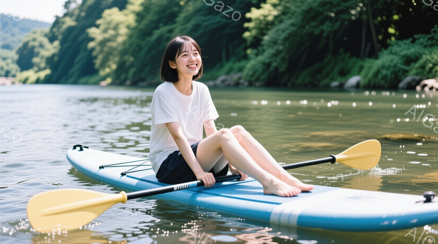 若い女性がサップボードに座り、微笑んでいます。白いTシャツと黒いショートパンツを着ており、髪は肩までの長さでストレートです。背景には緑豊かな植物と水面が見え、穏やかな夏の日の雰囲気が漂っています。