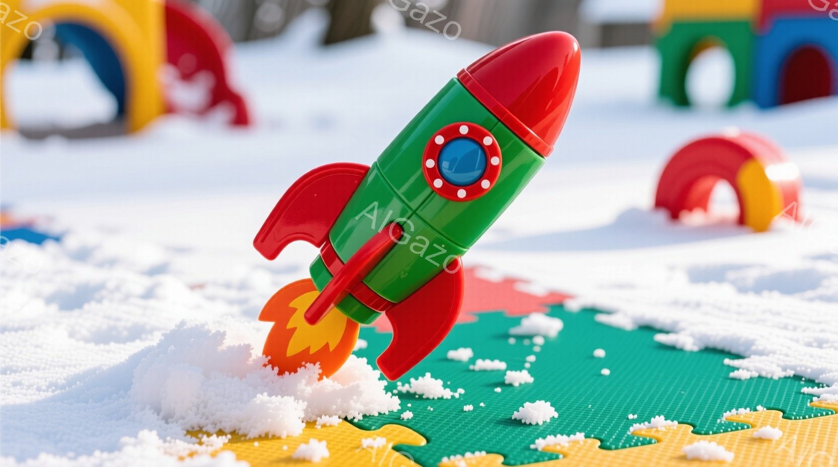 蒸気機関車が雪に覆われた架け橋を走っており、背景には可愛らしい雪化粧の家々が並んでいます。煙突からは白い蒸気が立ち上り、家の周りにはプレゼントの箱やクリスマスツリーが飾られ、冬の暖かく幻想的な雰囲気を醸し出しています。全体的に明るく色彩豊かで、おとぎ話のような温かい情景が広がっています。