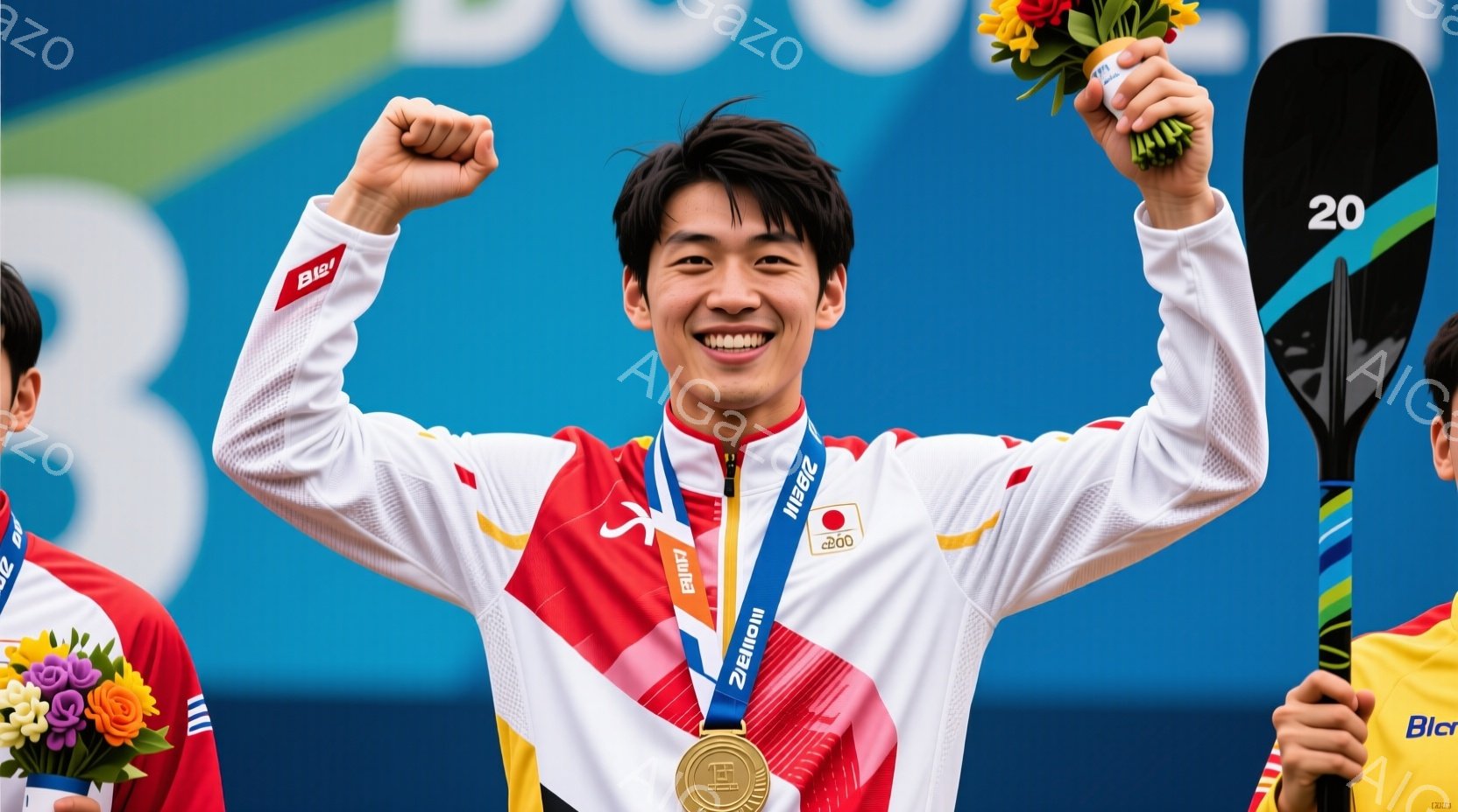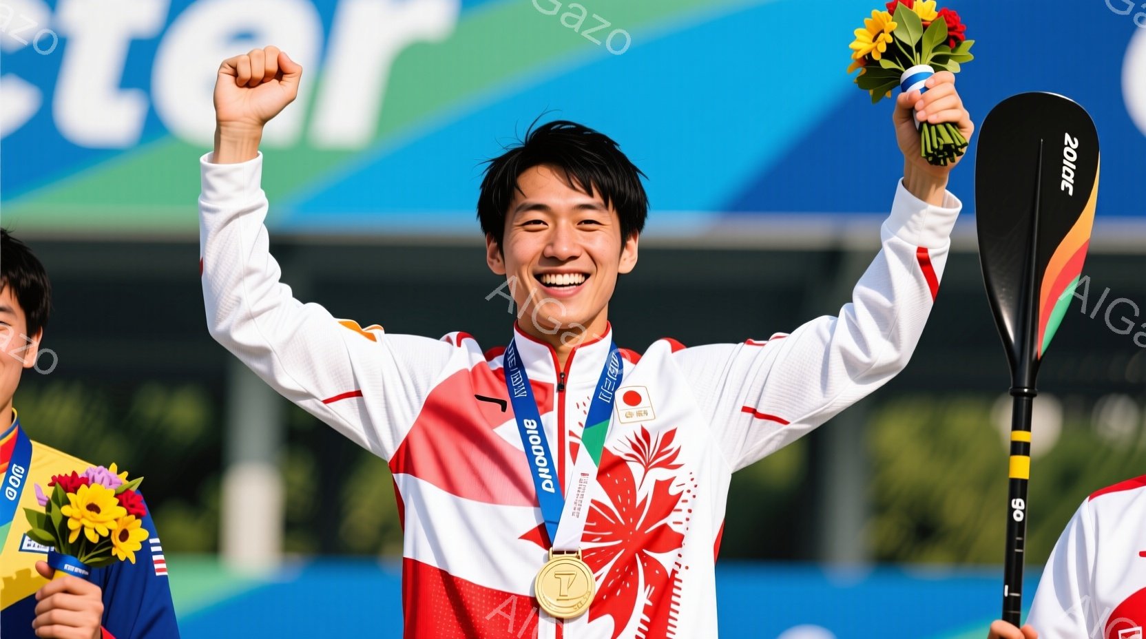 日本のカヌースプリント選手が金メダルを獲得し、満面の笑みを浮かべている様子を捉えています。彼は、赤と白のストライプが入った日本代表のユニフォームを着用し、首には金色のメダルが輝いています。背景にはぼやけた観客席と青空が見え、競技会場の興奮と喜びが伝わってきます。