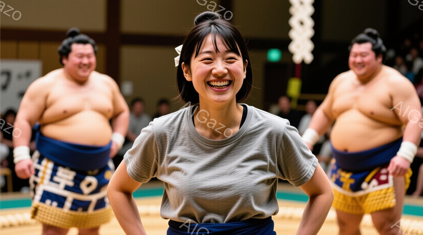 この無料AI生成画像「画像中央には、笑顔の女性が立っており、タンクトップとブルマを着用しています。彼女は両手を腰に当て、自信に満ちた姿勢でこちらを見つめています。背景には、相撲の稽古場と思わしき場所で、他の力士たちが稽古の準備をしている様子がぼやけて見えます。」は、2025年10月23日に作成されました。 サイズは 1664×928px の高解像度で、商用利用も可能なフリー素材として提供しています。