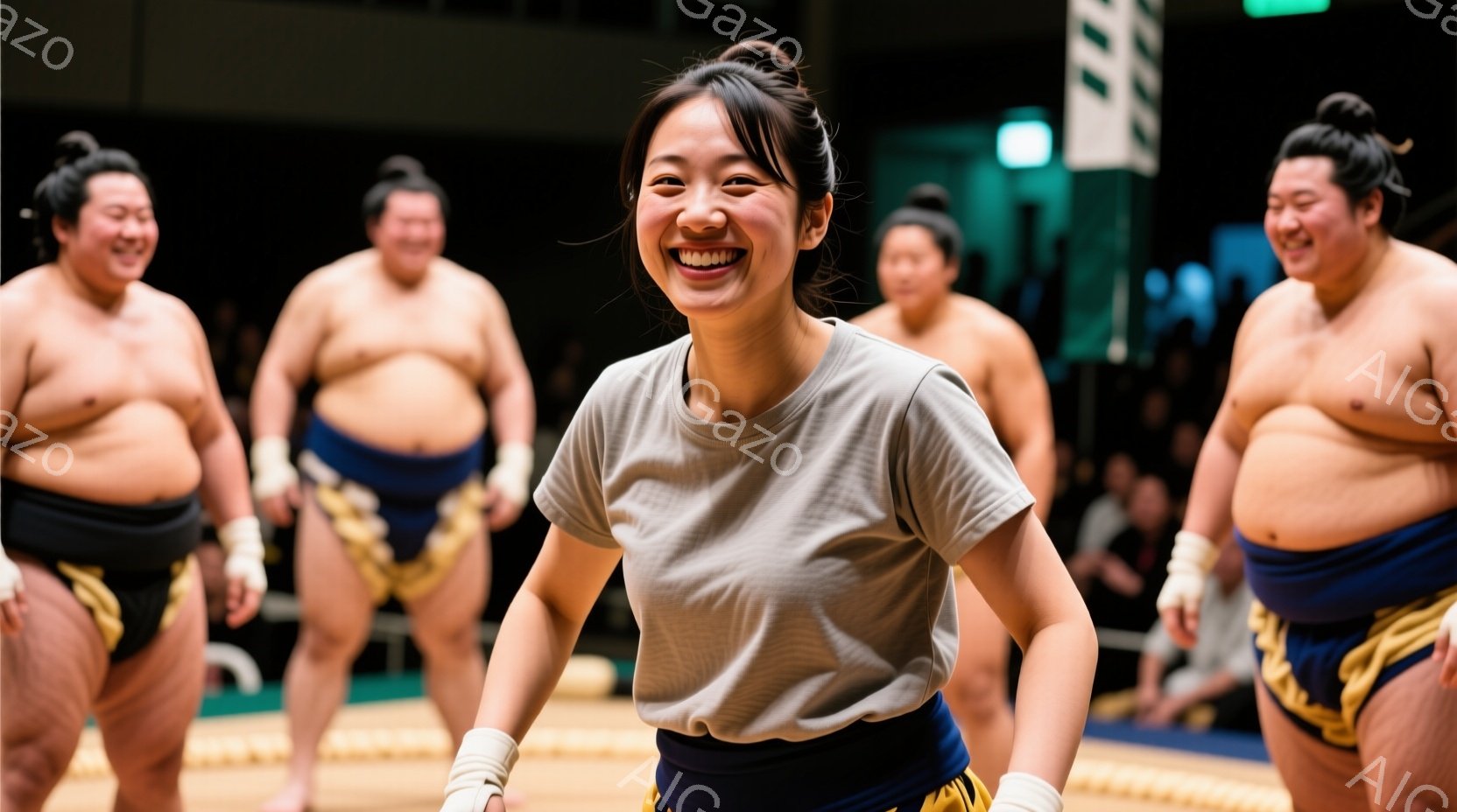跪いている女性は、クリーム色の地に鮮やかな花模様が描かれた着物を着用し、赤い帯を締めています。彼女は丁寧に手を合わせ、頭を下げており、真剣で敬虔な表情を浮かべています。背景には畳敷きの広場を取り囲む観客席と、障子のような壁が見え、伝統的な日本の儀式や祭りの雰囲気が漂っています。