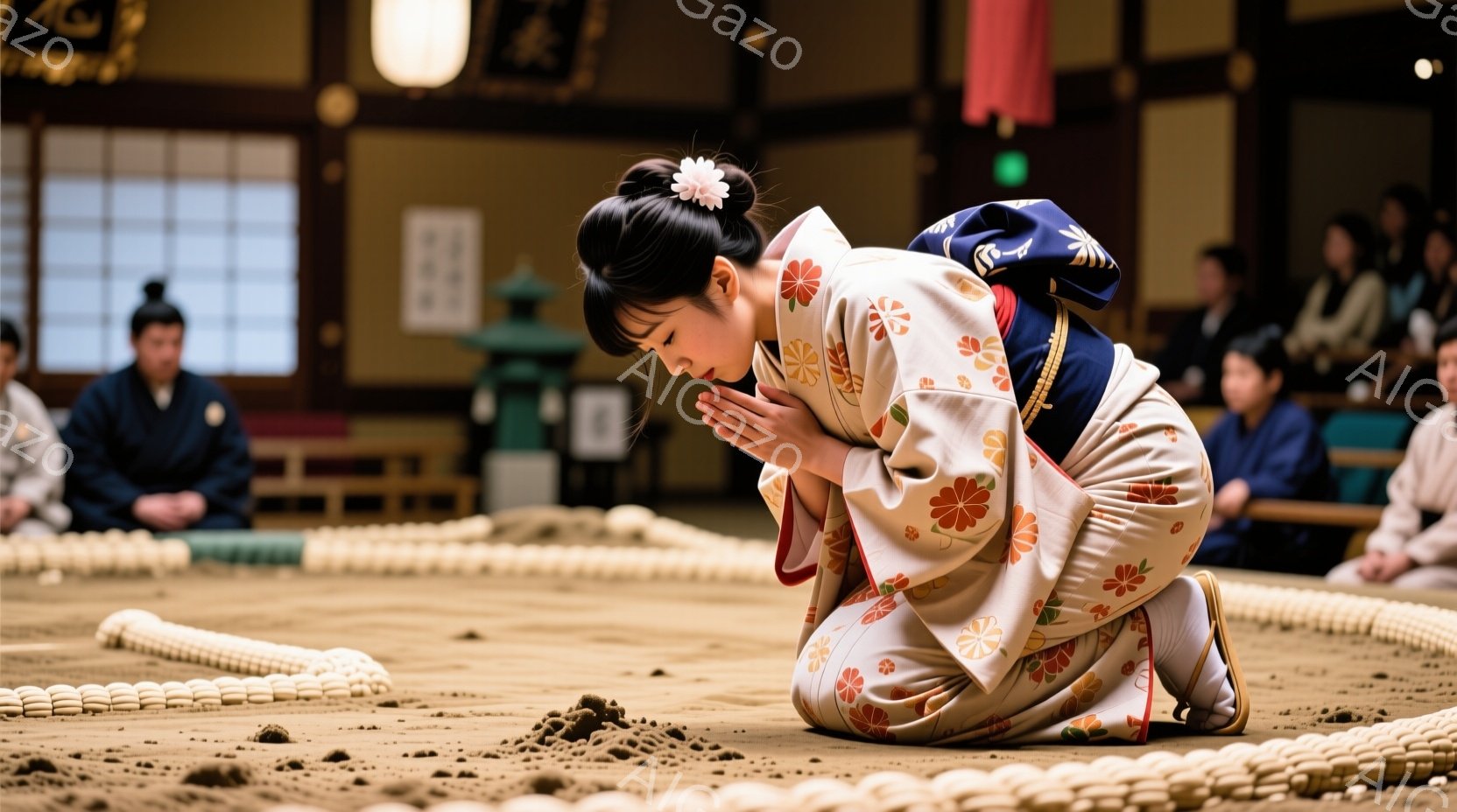 白い着物を着た女性が、相撲の土俵で深くお辞儀をしています。彼女の髪は伝統的な日本髪に結われ、白い花飾りをつけています。土俵は藁で囲まれ、背景にはぼやけた人影が見え、厳かで神聖な雰囲気が漂っています。