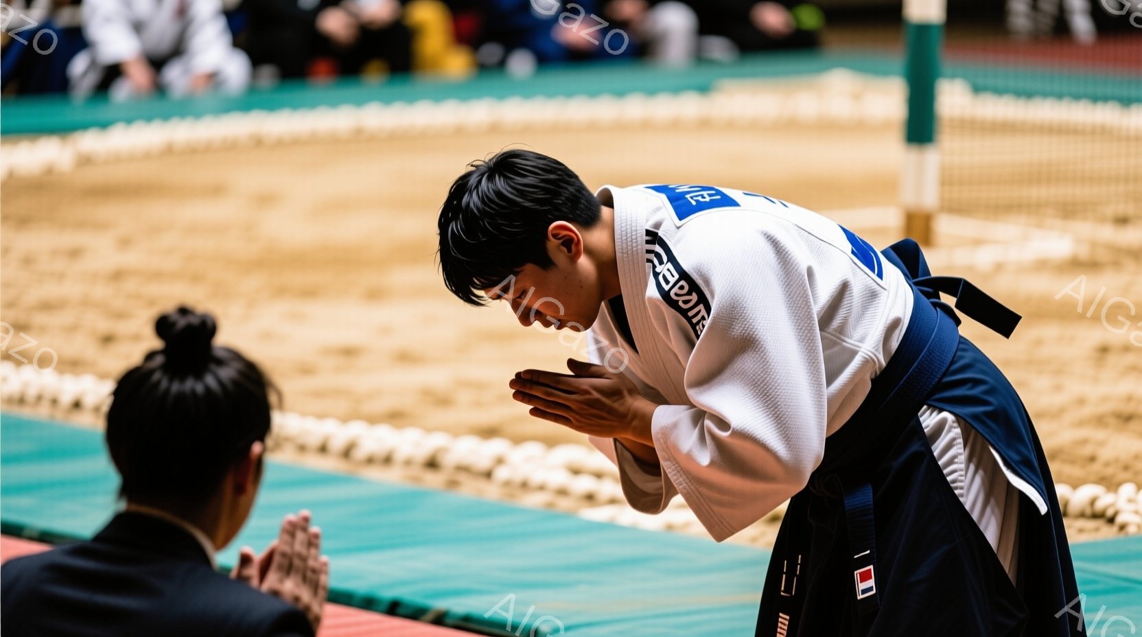 畳の上で柔道着を着た二人の男性が向かい合って礼をしている。片方は白の柔道着、もう片方は濃い青色の柔道着を着用しており、黒色の帯で締めている。背景には観客席が見え、柔道の試合前の厳粛な雰囲気が漂っている。